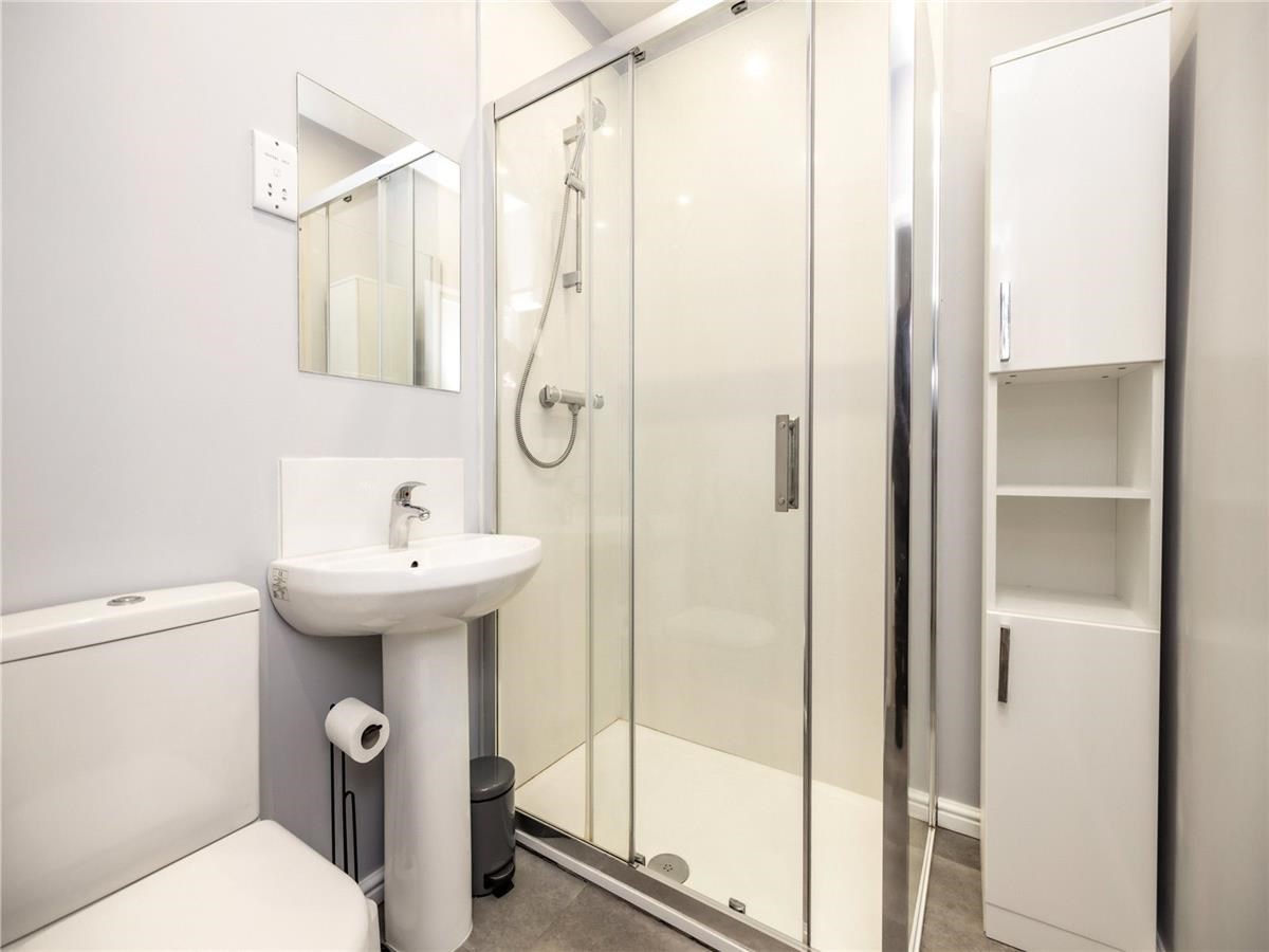 Fitted with a three piece cream suite comprising w.c., wash hand basin and bath with overhead shower. Built in storage.