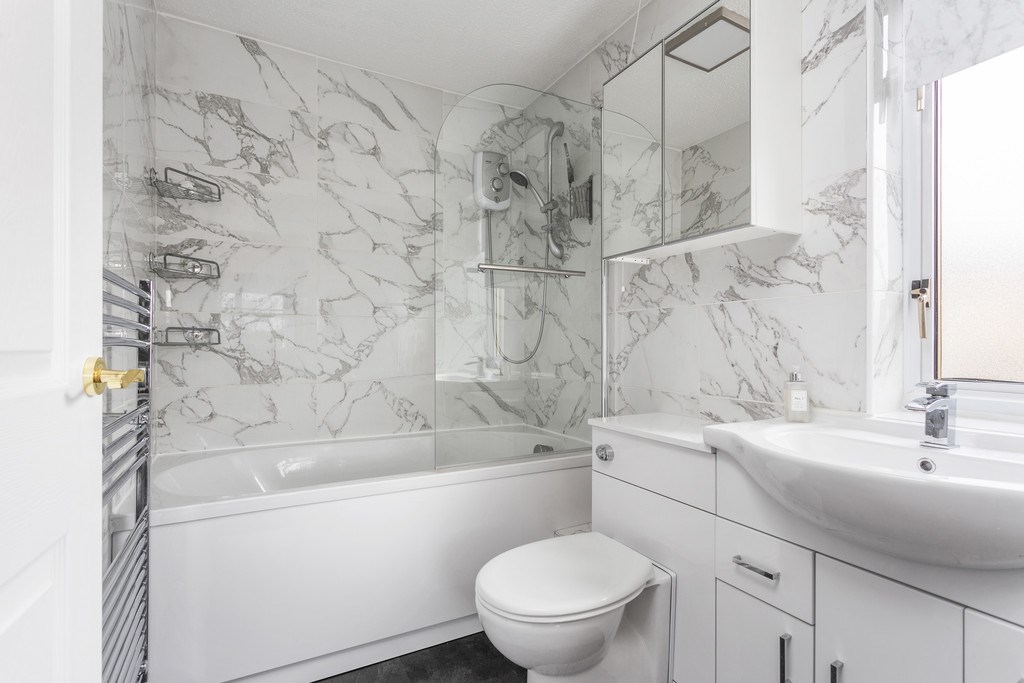 BATHROOM Modern bathroom with a white 3 piece suite with an electric shower over the bath. Vanity unit under the sink. Steel towel rail. Laminated floor tiling. Partially tiled walls.