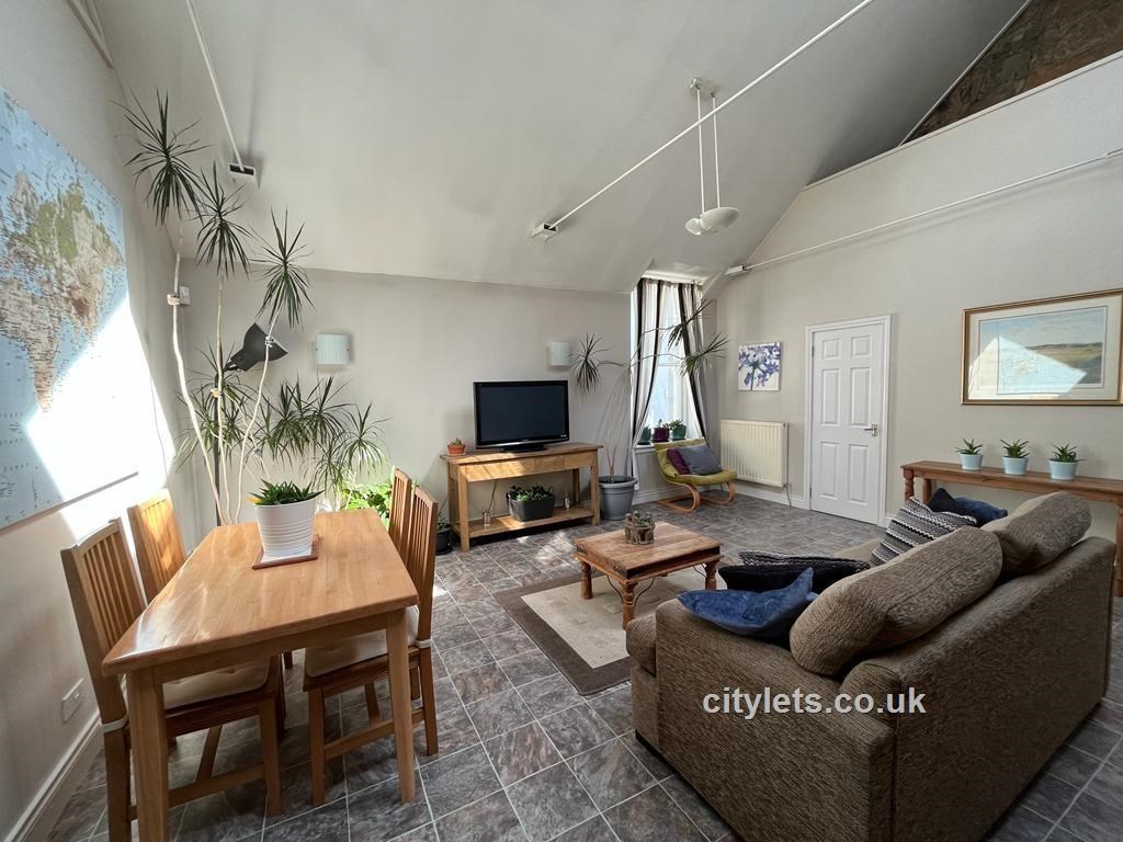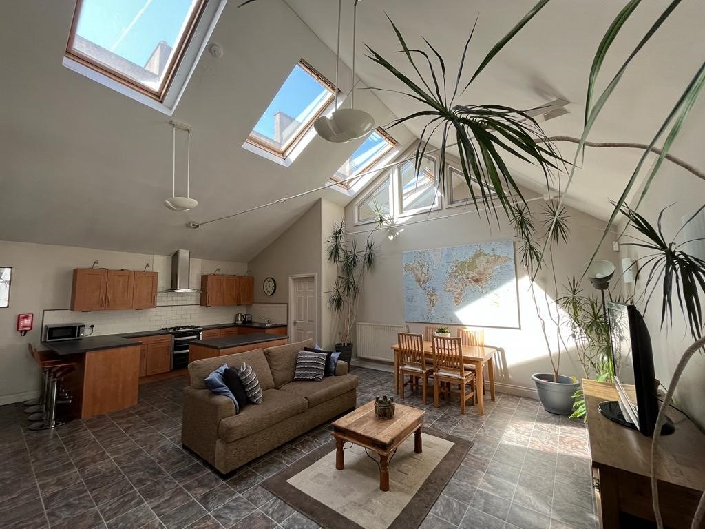 Entered via neat vestibule there is an open plan kitchen/ living room with dining area and tiled flooring. Tastefully furnished, the area is full of natural light thanks to the Velux windows and high ceiling.