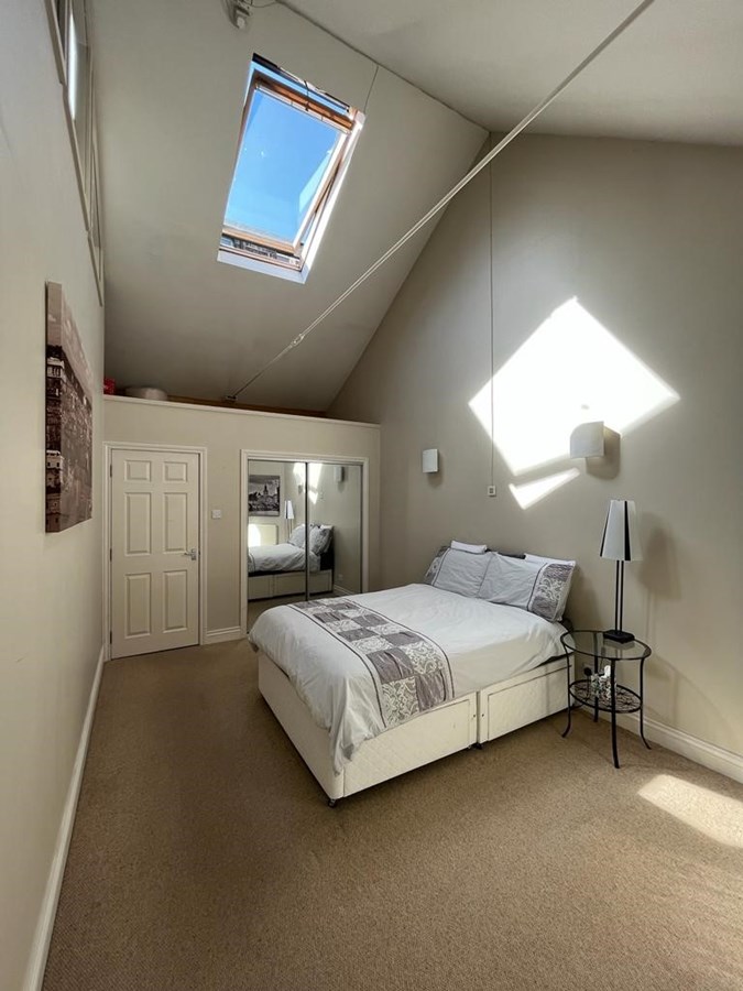 Hidden behind the door next to the kitchen, a short corridor leads to a beautiful and spacious double bedroom with built in wardrobe and ceiling window, modern shower room and separate toilet.