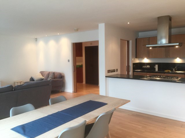 Located on the second floor, this modern and well-maintained flat offers bright, open-plan living in a convenient setting. The spacious living and dining area features real wood flooring, with an electric sliding door providing a stylish partition to the fully fitted kitchen. The kitchen includes a gas oven and hob, dishwasher, fridge, separate freezer, and ample storage space.