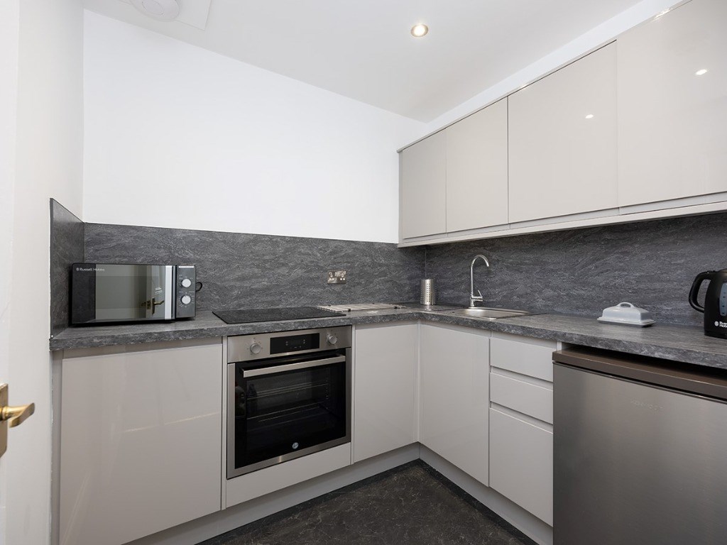 The modern, stylish kitchen comes with an electric hob, oven and full sized dishwasher, microwave and kettle. It has plenty of cupboard storage and a good amount of worktop space.