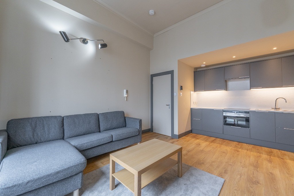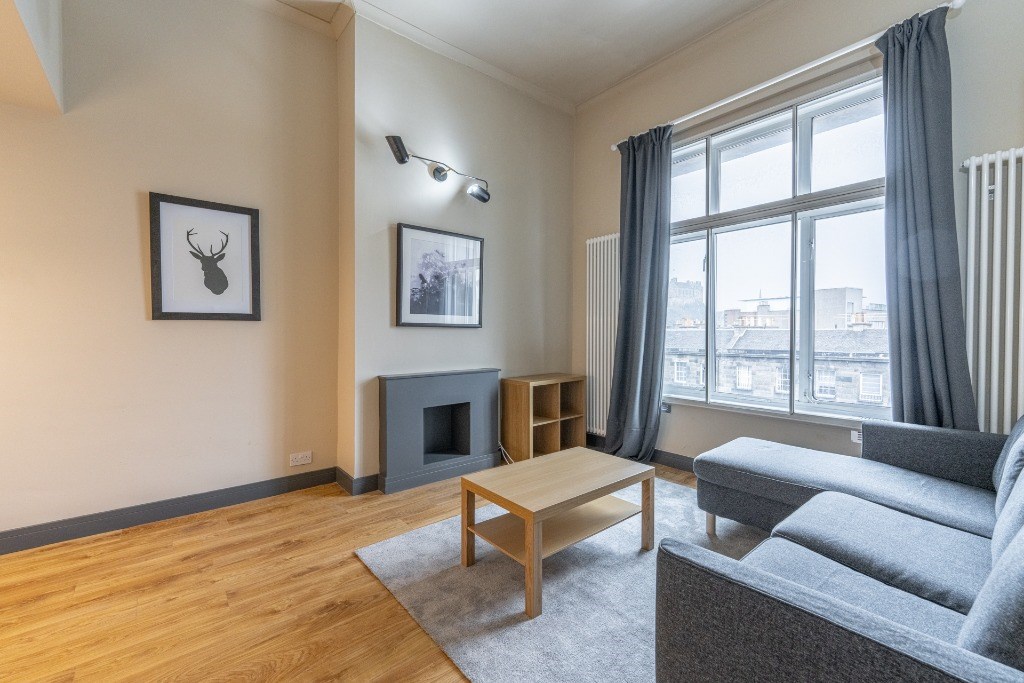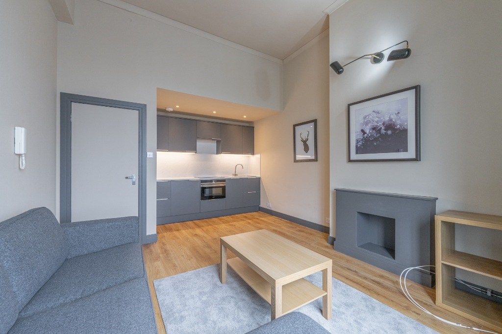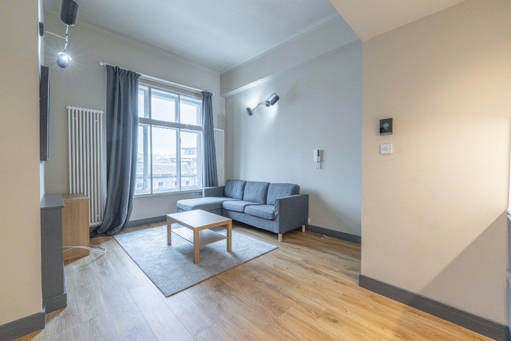 The property is reached via a secure shared entrance, a foyer, and a lift service. The front door opens with a warm welcome into a hall, which sets high standards. The open-plan living room and kitchen is ahead. Here, light décor is paired with an easy-to-maintain floor creating a modern aesthetic that is easy to style. A feature mantelpiece frames the room, providing a focal point for lounge furniture, and a large window brings an abundance of natural light into the space, offering one of the finest views of Edinburgh Castle. The kitchen itself is neatly arranged along the back wall, fitted with contemporary cabinets and downlit worksurfaces, streamlined by integrated appliances. It has an attractive design that complements the colour scheme; plus, it is supplemented by a utility room. Meanwhile, the double bedroom echoes the style of the living area and shares the same aspect too. It is well-proportioned and equipped with generous wardrobe storage. Furthermore, there is a box room, which could be used as an office. The home is completed by a three-piece bathroom, comprised of a washbasin, a toilet, and a double-ended bath with an overhead rainfall shower.