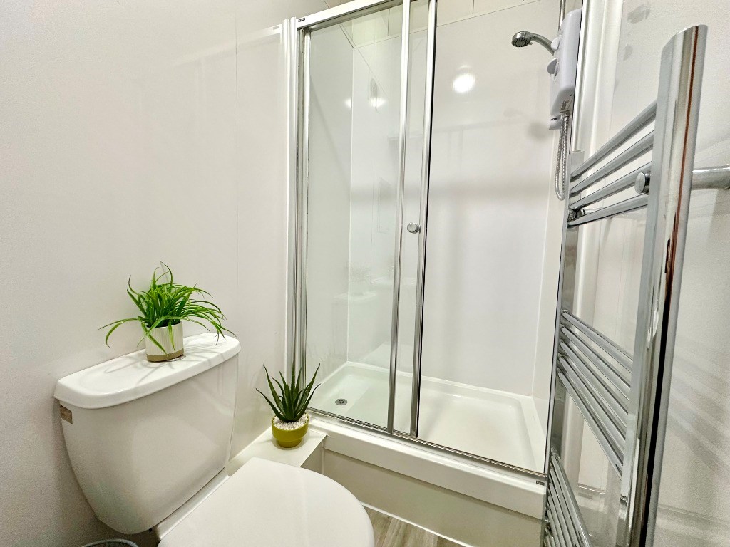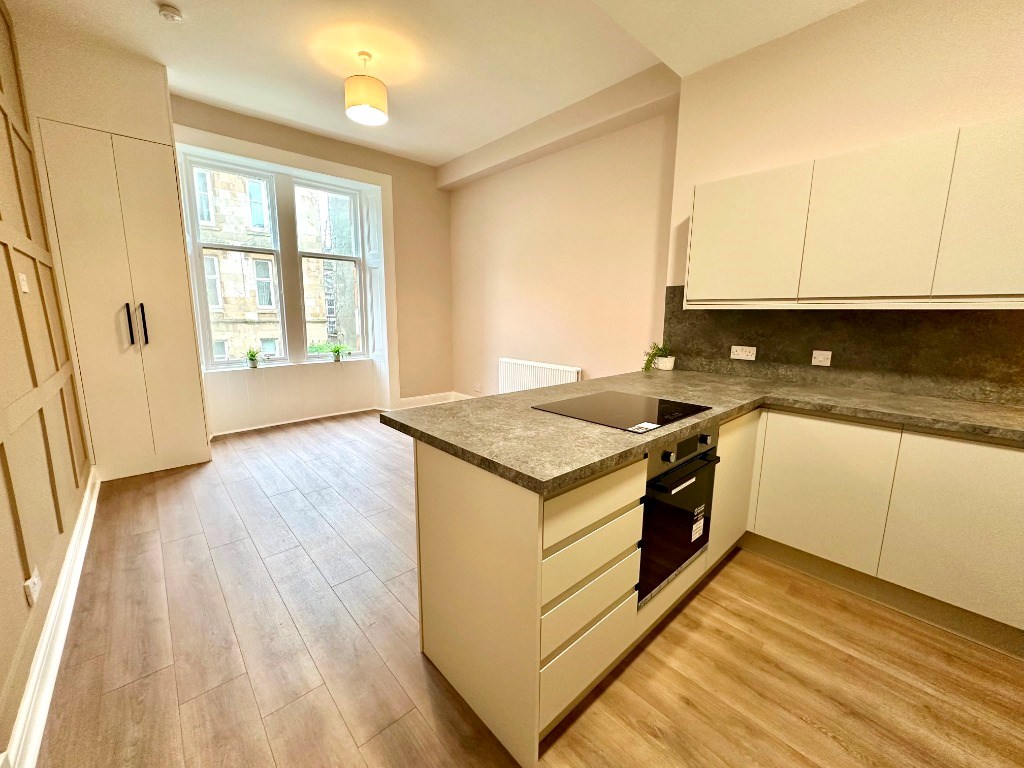 The flat is located within a traditional tenement building in popular Hillhead in Glasgow and is situated on the preferred first floor which is accessed only via stairs. Internally the property comprises of a welcoming L shaped reception hallway whch gives access to all rooms. There is a bright open plan living room / kitchen features a brand new modern kitchen with island for dining options and new appliances including fridge freezer, washing machine, ceramic hob and electric oven, two good sized double bedrooms one having a large storage cupboard off and finally the fully fitted modern internal shower room with white ceramics and walk in shower cubicle with electric shower.