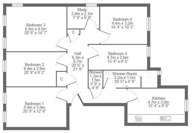 The accommodation is located on the second floor and comprises of large entrance hallway with storage cupboards off, five generously sized double bedrooms, two shower rooms, large dining kitchen and a study.