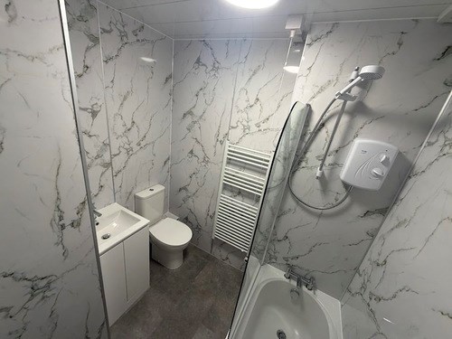 Bathroom-Brand new white suite with electric shower over bath