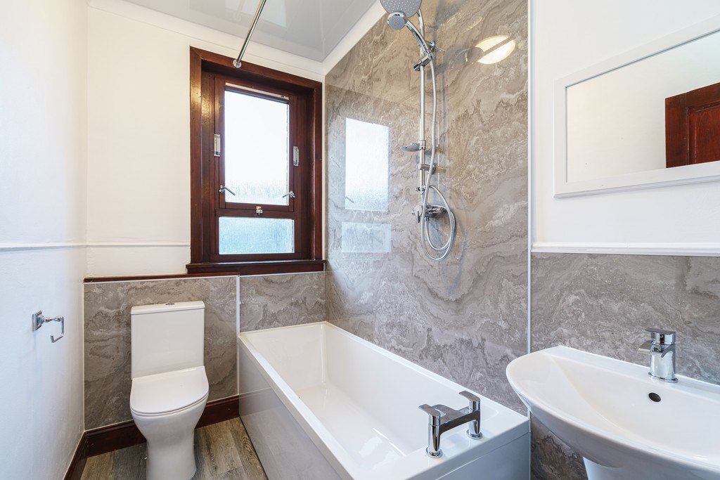 BATHROOM Modern three piece white suite with shower over bath.
