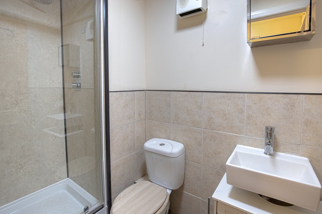 BATHROOM The good-sized bathroom features a free-standing sink with vanity storage, a free-standing toilet, and a separate shower cubicle. The shower is complemented by beige aqua panelling, while the rest of the space is finished with beige-tiled surrounds. A mirror vanity unit adds both functionality and a touch of elegance to the room.