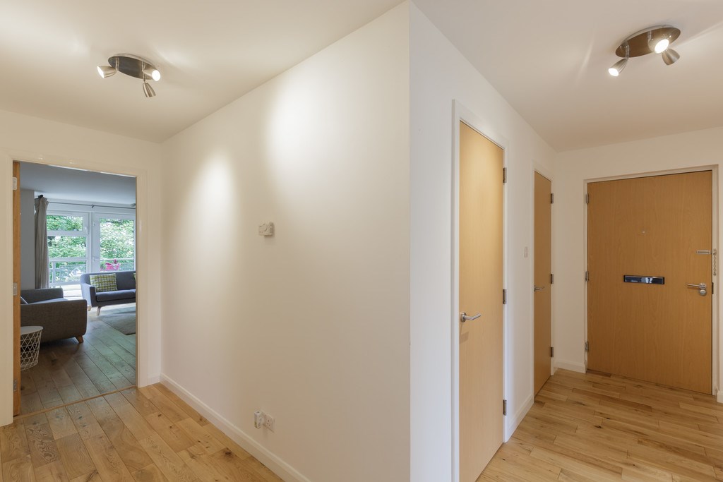 HALLWAY A welcoming central hallway finished with wood flooring and neutral walls. The space provides access to all main rooms, includes storage cupboards, and has a clean and modern feel upon entry.