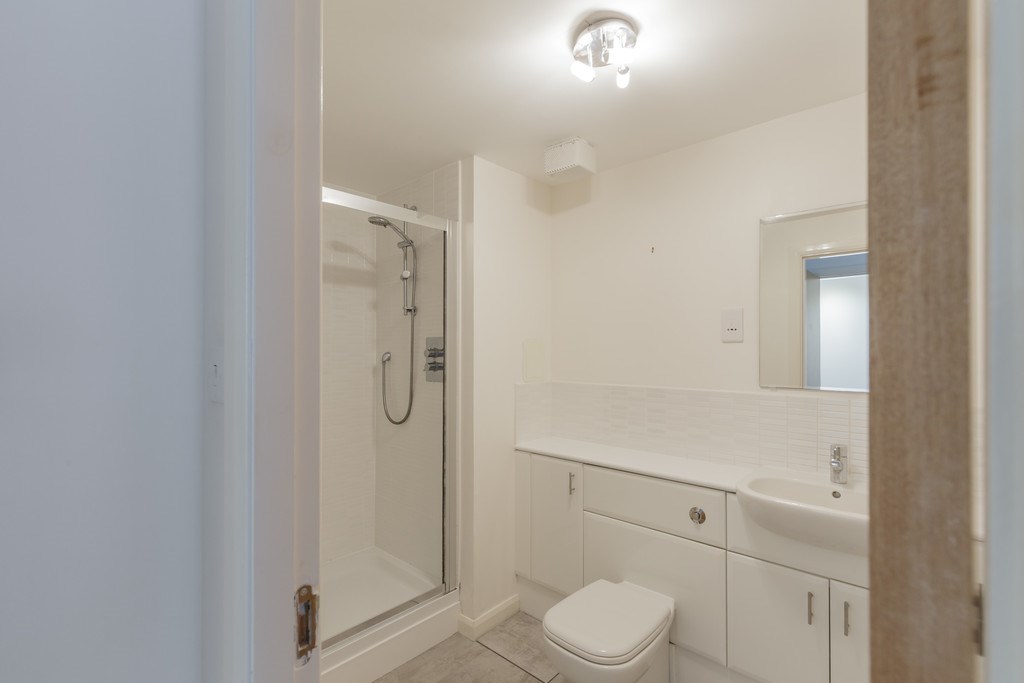 The adjoining en-suite includes a modern basin with vanity unit, WC, and neutral tiling, offering privacy and convenience.
