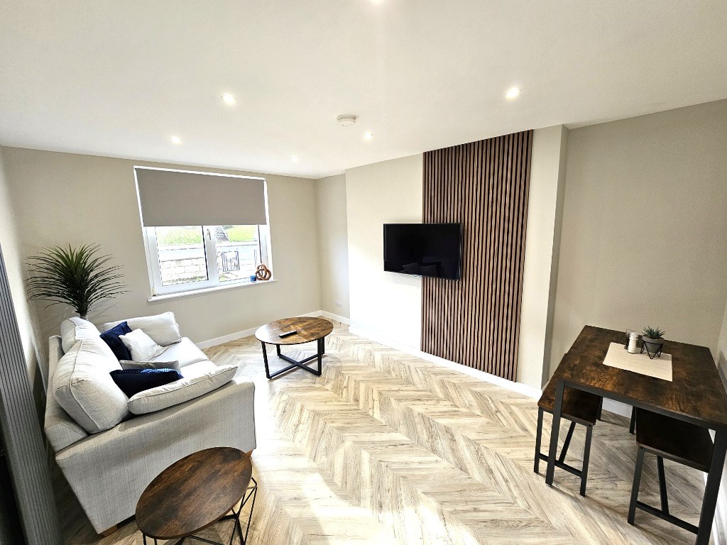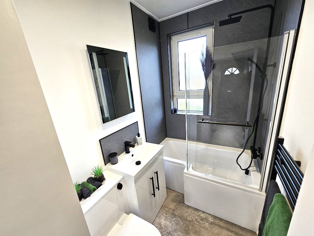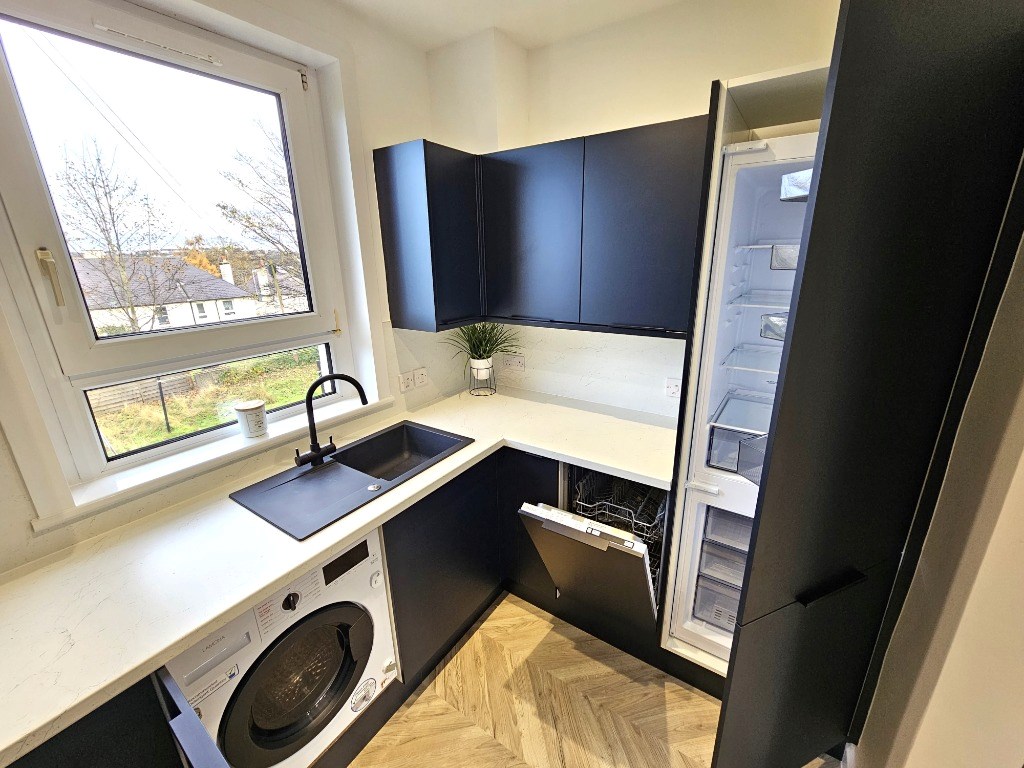 Modern kitchen with dishwasher, washer/dryer and full size fridge freezer: 2 Double bedrooms with storage: Modern bathroom with shower over bath: Large living room with dining area and feature TV on the wall.