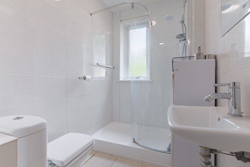 BATHROOM Modern three piece white suite with shower large shower cabin and white colour tiles.