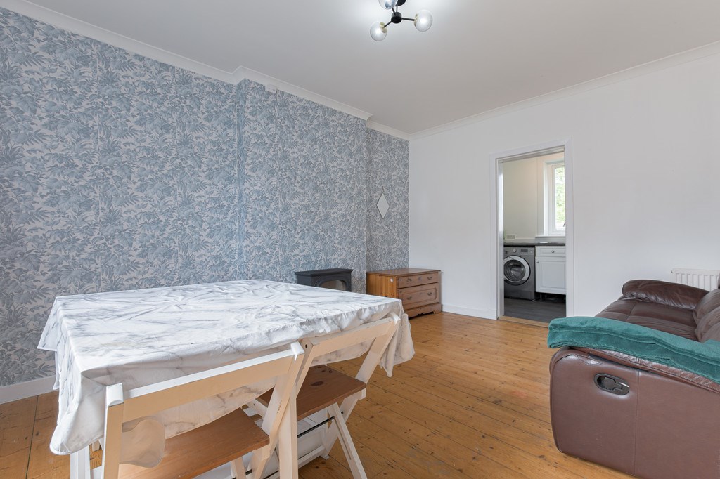 LOUNGE/DINER Facing out to the front of the property, the open plan living and dining area comprises of a large double glazed window, allowing an a flood of light. The living room benefits from neutral wall and a blue featured wall and wood effect flooring, making a bright, spacious environment. The living room is furnished with a large, three seater brown leather sofa, wooden book case and 2 seater dining table which would seat four comfortably.