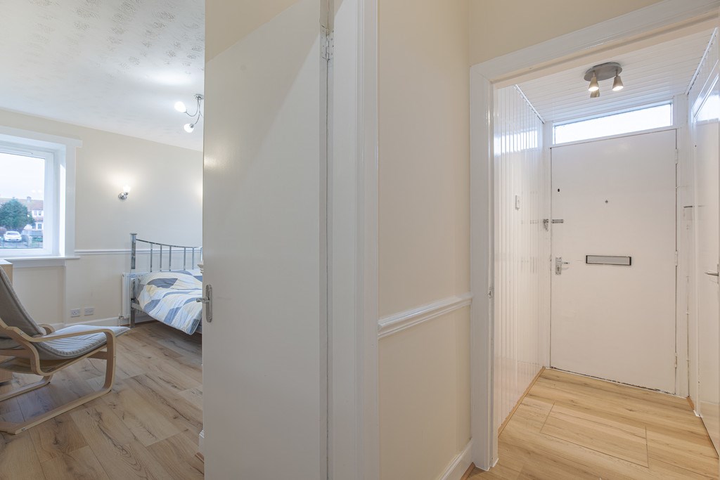 BEDROOM 1 The first bedroom for this property is located on the left as you enter, and greets you with a This a bright, welcoming interior with a calm and comfortable feel. The large window lets in plenty of natural light and offers a pleasant view of trees and neighbouring rooftops, The room features a double bed, wooden chest of drawers, wooden standing wardrobe and two double door wardrobe spaces for that added storage aspect.