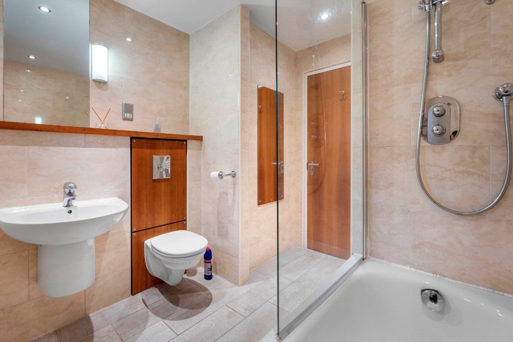 The flat has two double bedrooms, both with built in wardrobes and fitted blinds/curtains. There is a modern, family bathroom with bath, separate shower, WC and wash hand basin.
