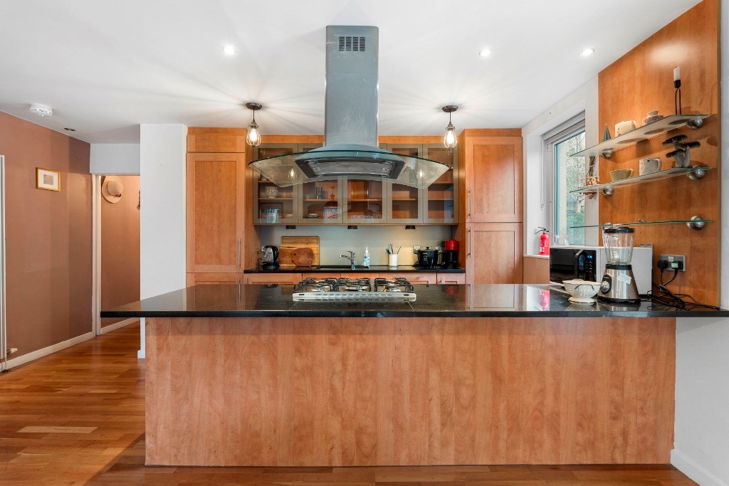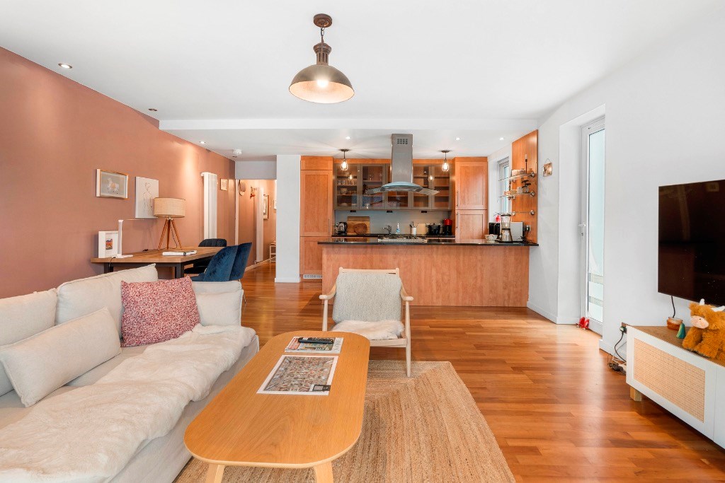 The living room/kitchen is open plan and offers an abundance of space leading out to a private balcony and additional terrace. The kitchen has numerous fitted wall and base units and also benefits from a large island, ideal for entertaining.