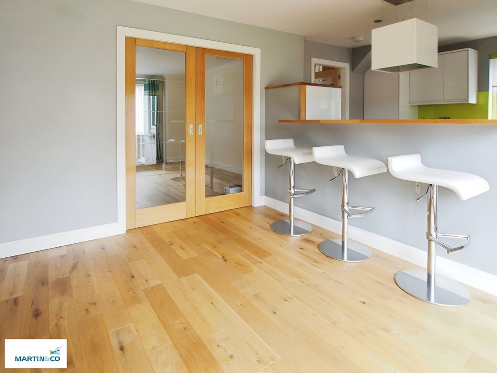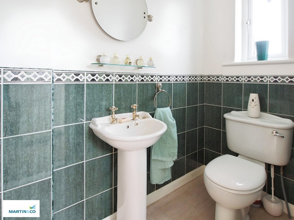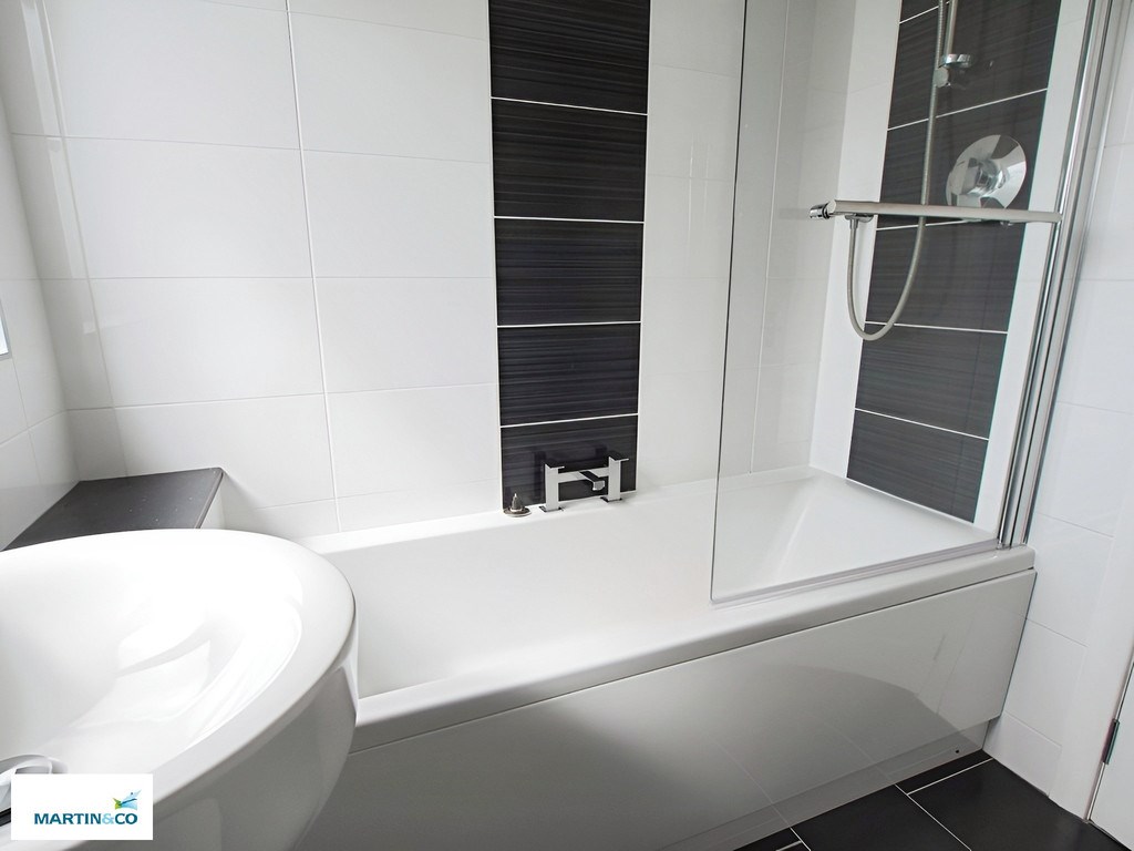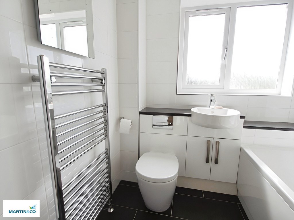 Accommodation comprises three well-proportioned bedrooms. The master bedroom benefits from built-in wardrobes, while two additional double bedrooms offer ample space for family or guests. The modern bathroom is equipped with a heated towel rail and an over-bath shower, while a convenient downstairs W/C adds further practicality.