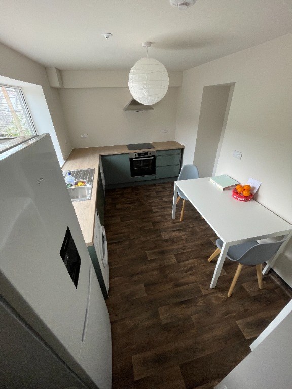 This room is light and airy and is furnished with a double bed, bedside table and drawers. The communal spaces of the flat are shared with just one other student room and comprise a furnished lounge with a separate desk area, a stylish bathroom with shower over bath, and a spacious kitchen with a table and chairs, washer/dryer, dishwasher, electric hob/oven and large fridge freezer.