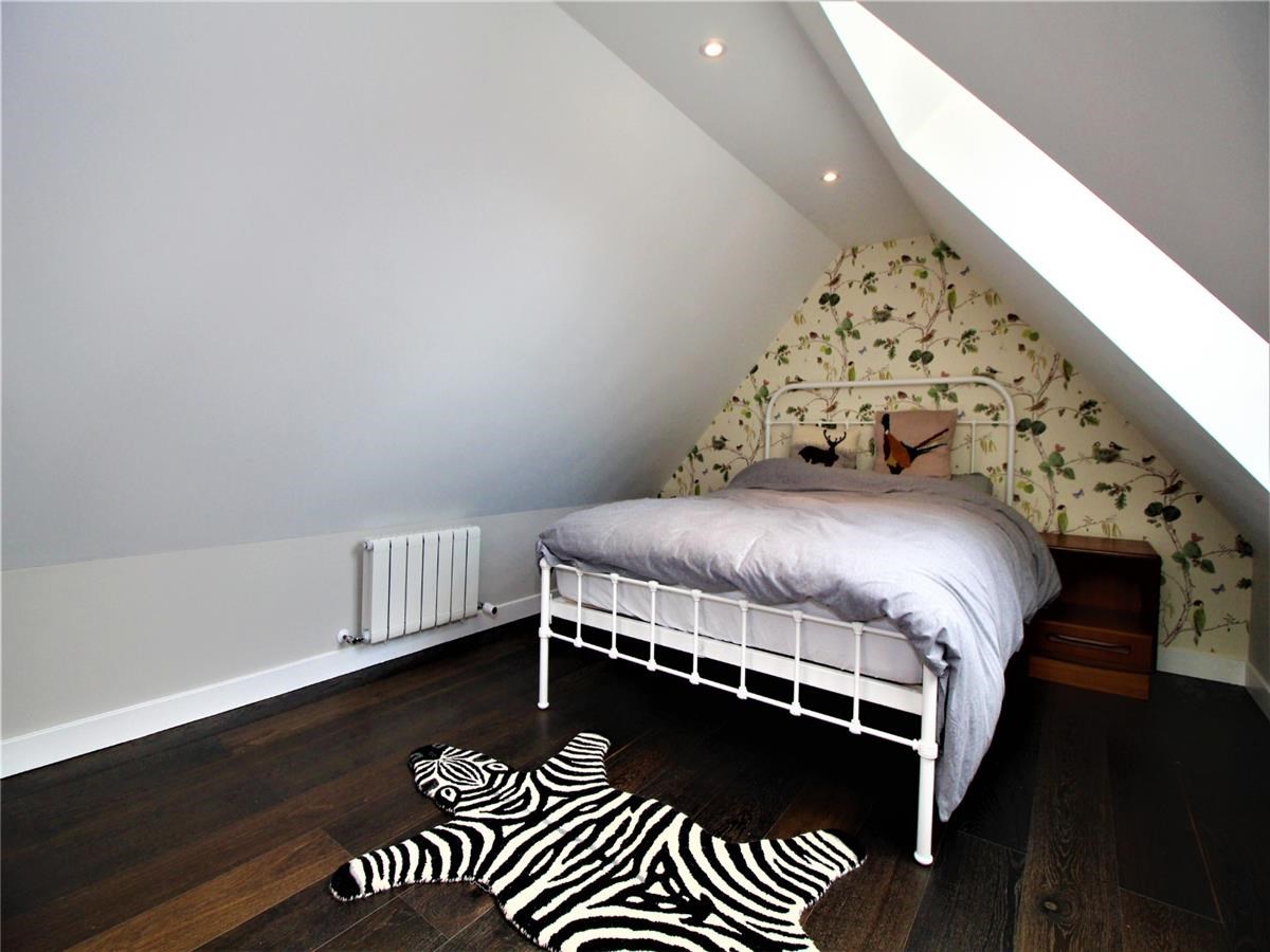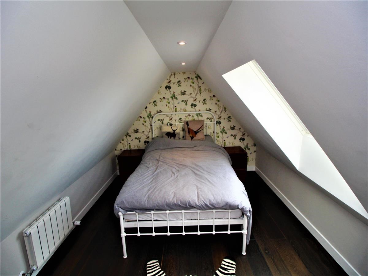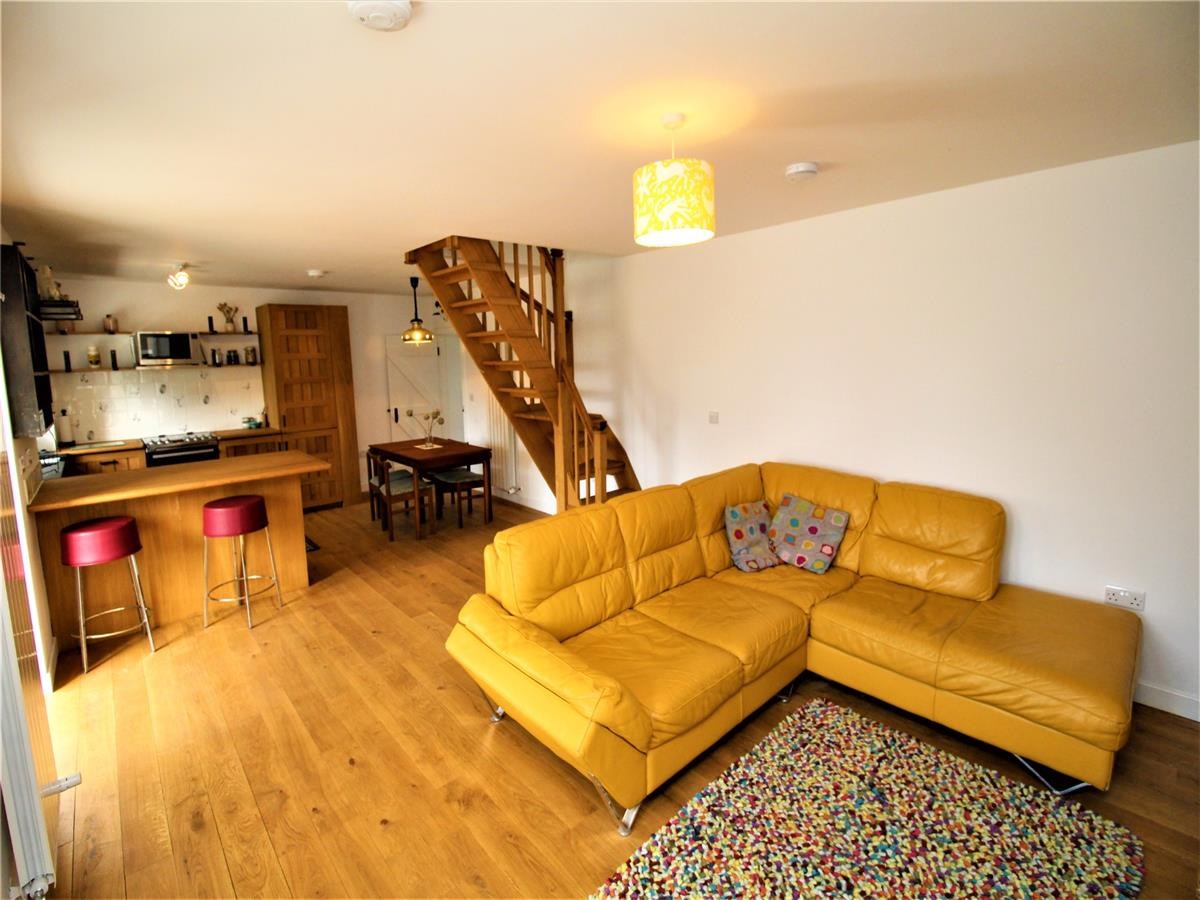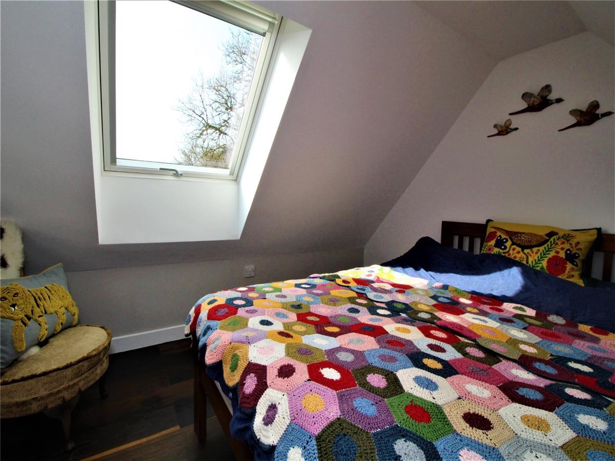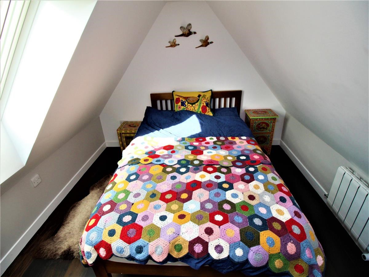 Bedroom 1/study benefits from dual aspect glass window and door overlooking the patio and gardens. Bedrooms 2 and 3 are accessed via a beautiful oak hardwood staircase. Both bedrooms have coombe style ceilings and Velux windows.