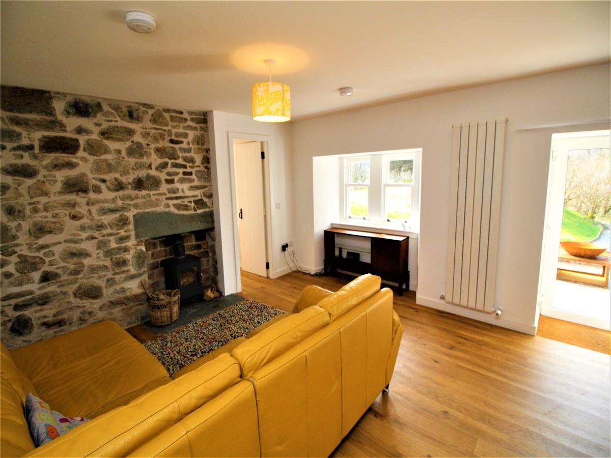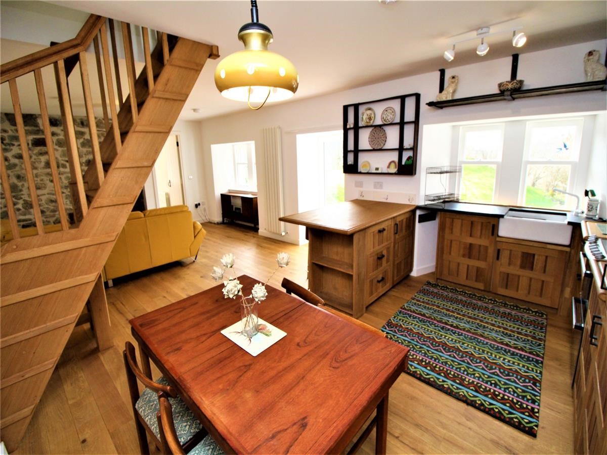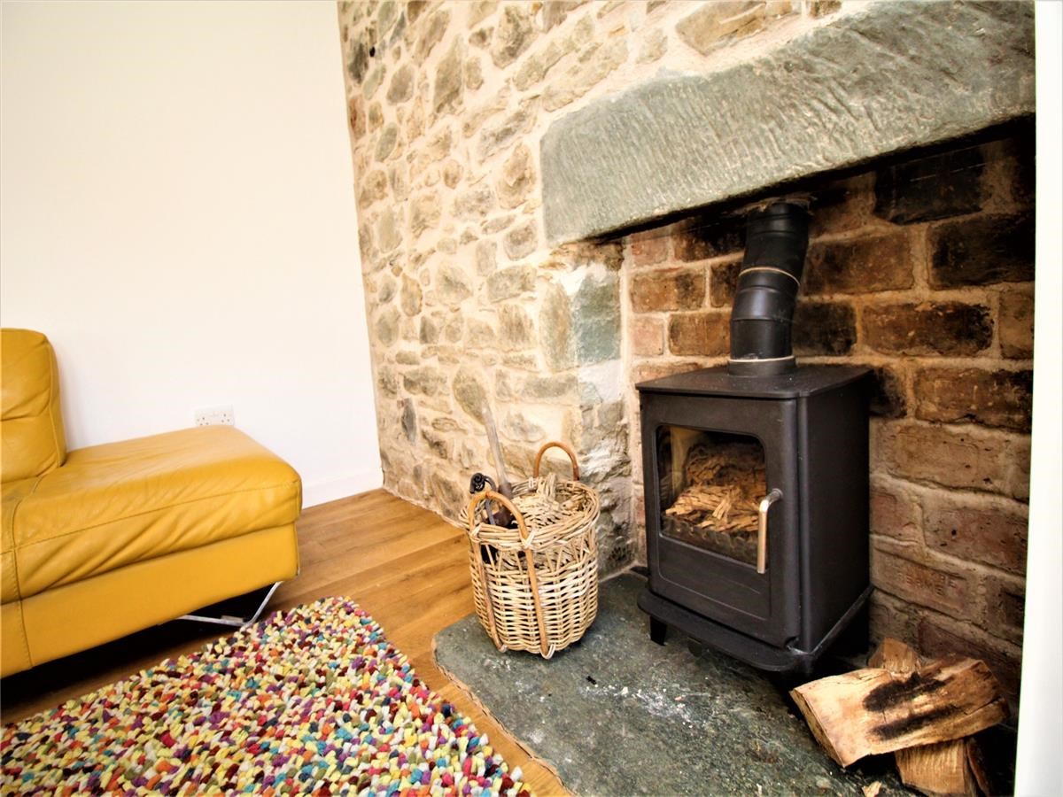 The property compromises of a large open plan kitchen / living room, utility room, large family bathroom, bedroom/ study, and two double bedrooms upstairs. The outer door leads to the open plan reception area with recessed matwell, stylish open plan sitting and dining room with engineered oak hardwood flooring. Within the living room there is a exposed natural-stone feature wall with an inset log burner on a flag stone hearth. The newly fitted oak hardwood kitchen is immaculately presented with a Belfast sink and a combination of slate and hardwood worktops.