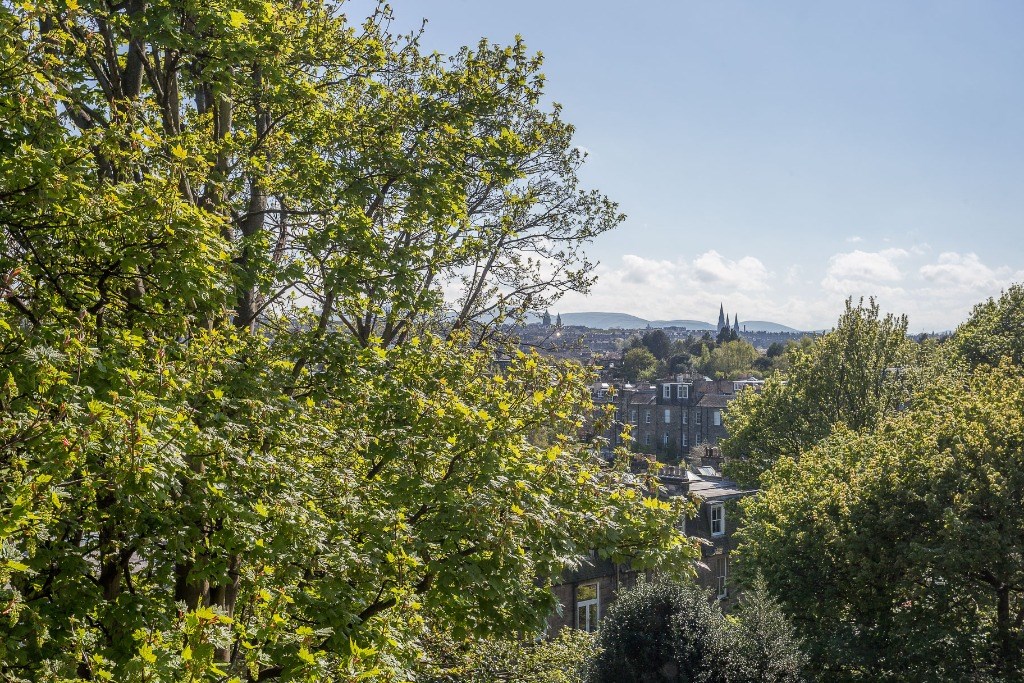 The accommodation is both spacious and versatile, comprising a welcoming entrance hall with storage cupboards, leading to an impressive sitting/dining room with triple aspect windows to the front, side and rear. This wonderful living space is flooded with natural light throughout the day and at during the year, offers amazing views across the city skyline towards Edinburgh Castle and Calton Hill — a truly special outlook.