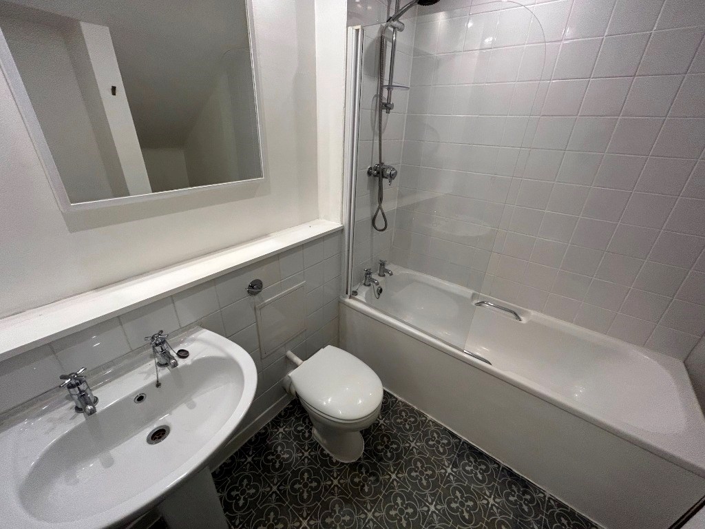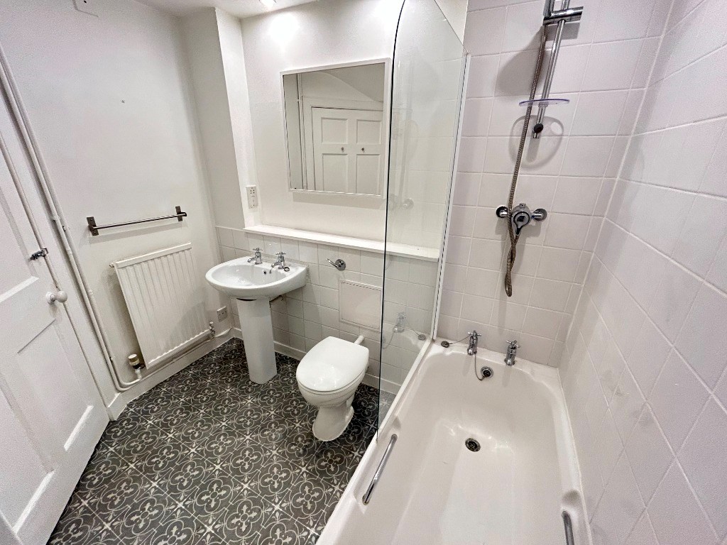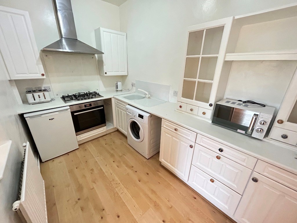 To the end of the hallway on the left is a modern bathroom with shower over bath. Ample storage is available at the end of the hallway with a good sized cupboard. To the right is a bright and spacious kitchen, equipped with a fridge, washing machine and gas oven/hob, plus newly purchased top of the range Kettle, Toaster and Microwave oven.