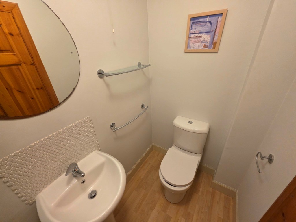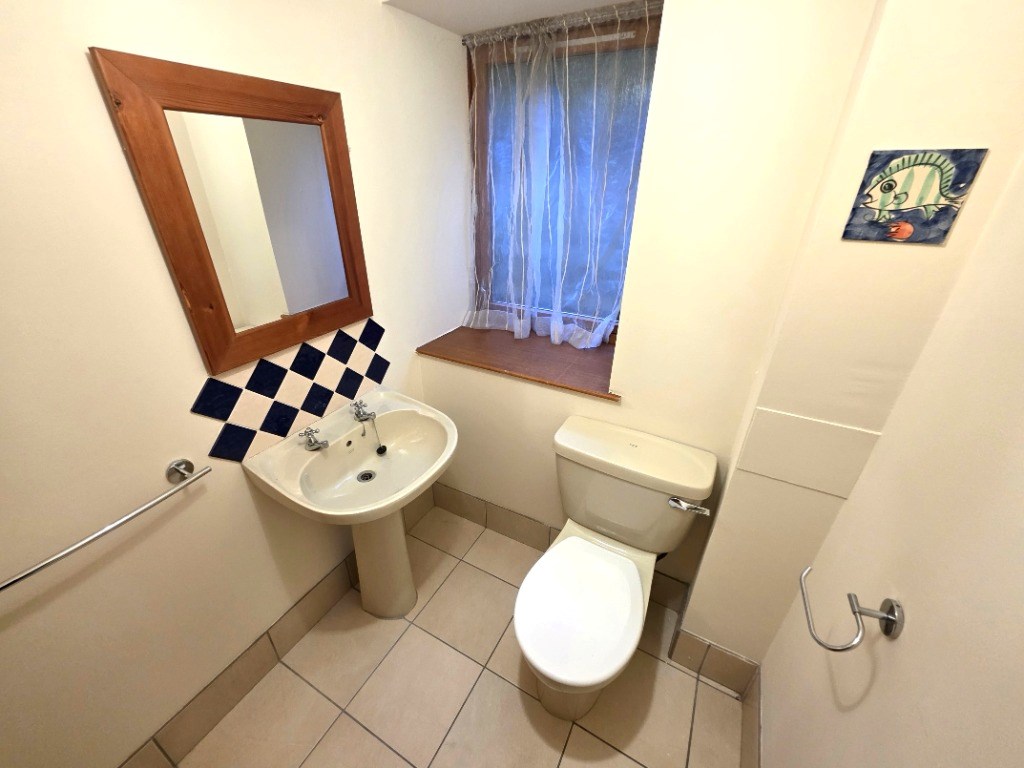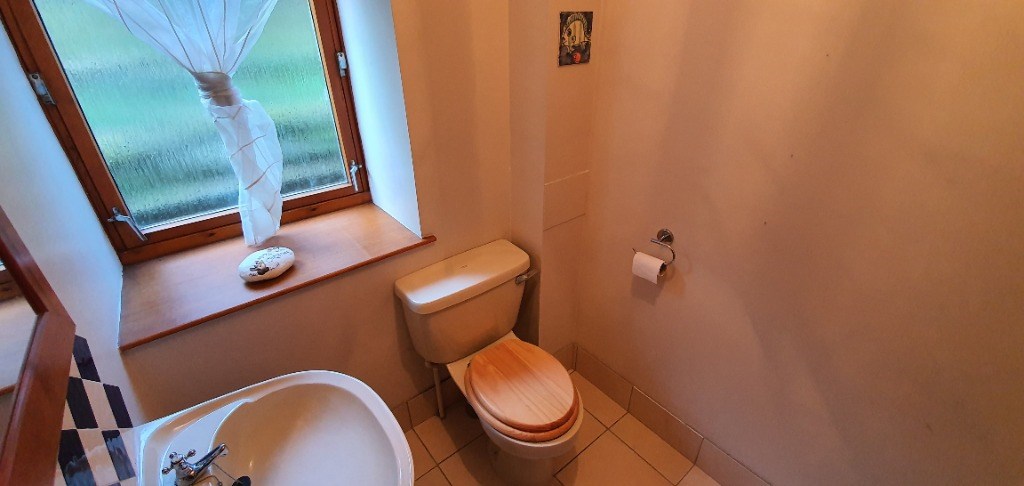 Cloaks/W.C. Fitted with a retro style pastel coloured suite comprising a w.c. and wash hand basin, there is a deep silled window and ceramic floor tiling.