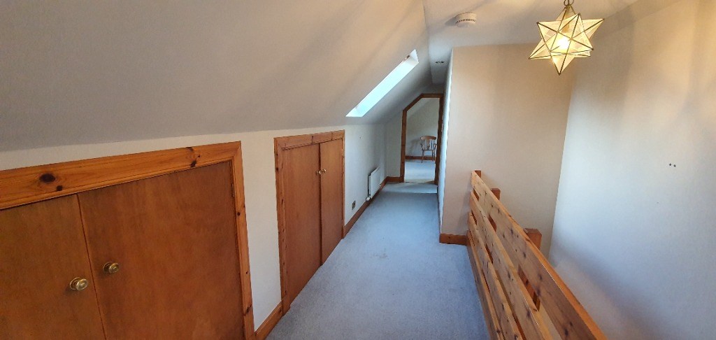 First Floor The carpeted staircase leads to the first floor galleried style landing which gives access to two double bedrooms and the bathroom. The two large velux windows and an additional landing window fill this area with natural light. Two built-in storage cupboards and additional eaves storage beside the window.