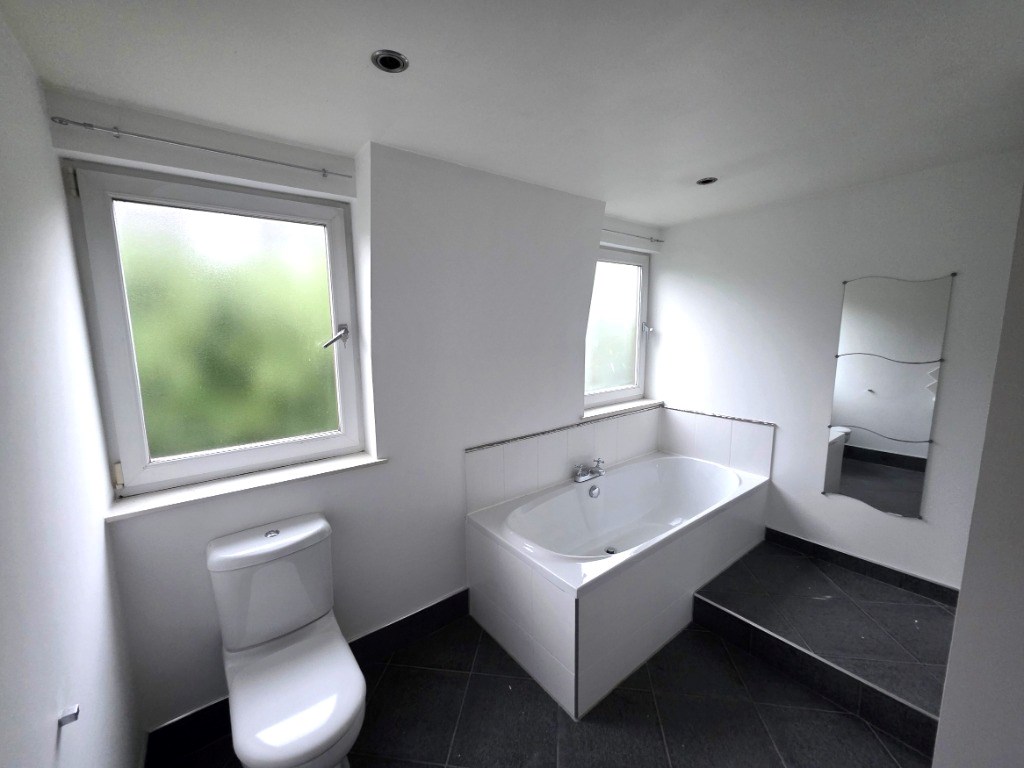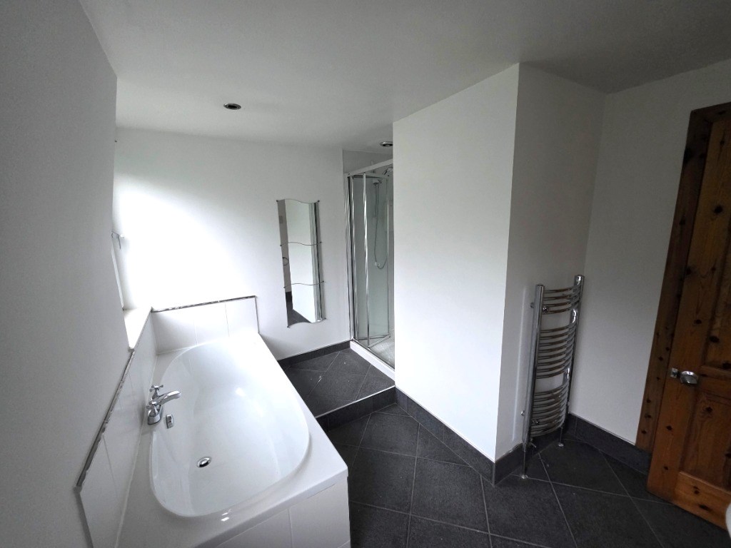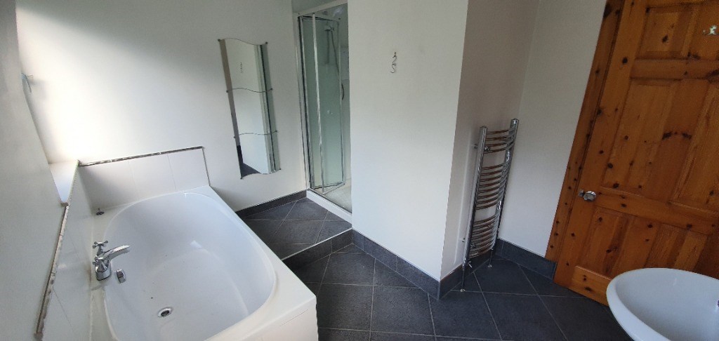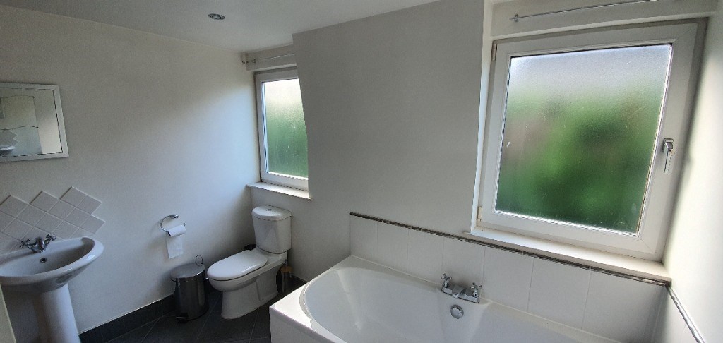 Bathroom 10’3” x 8’5” [3.14m x 2.85m] approx. Filled with natural light from the two uPVC opaque glass windows with the w.c. below, the family bathroom also includes the wash hand basin with attractive tiling, mirror and shaver point above. The large bath includes splashback tiling. The shower cubicle is lined with wet wall and includes a light/fan above. Chrome ladder heated towel rail. Wall mounted mirror. Downlighters.