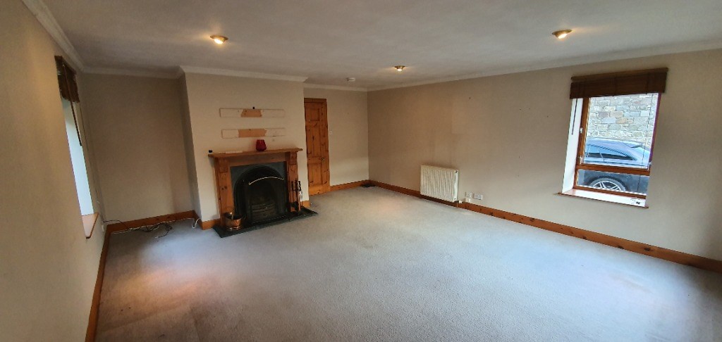 Lounge 19’10” x 16’4” [6.05m x 4.97m] approx. The spacious lounge includes windows on three sides, flooding the room with natural light, and an ornate feature fireplace includes a real fire, cast iron surround and slate hearth. Ornate cornice. Downlighters.