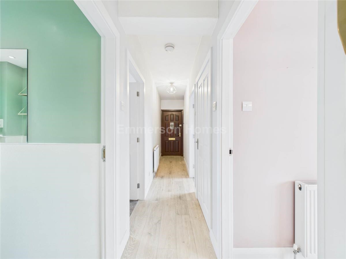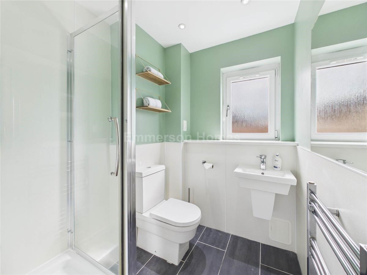The inner hall leads to a large front facing double bedroom with fitted wardrobes, a second double bedroom with views to the rear, a modern shower room with white suite and mains shower with enclosure.