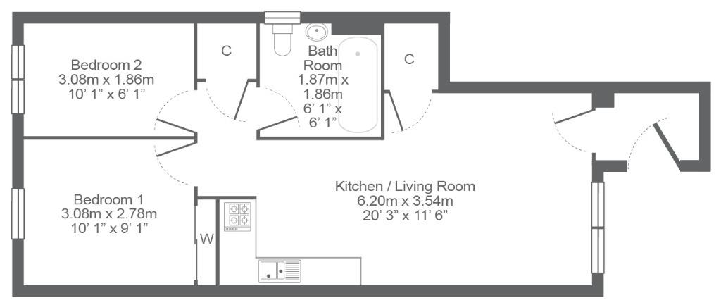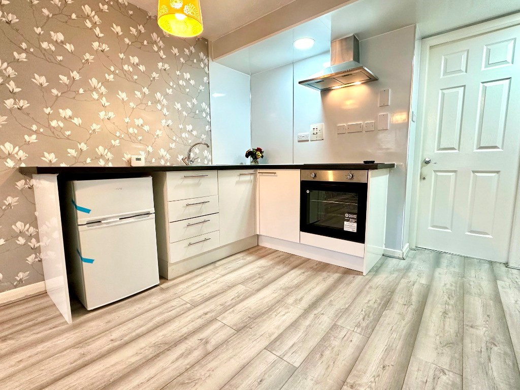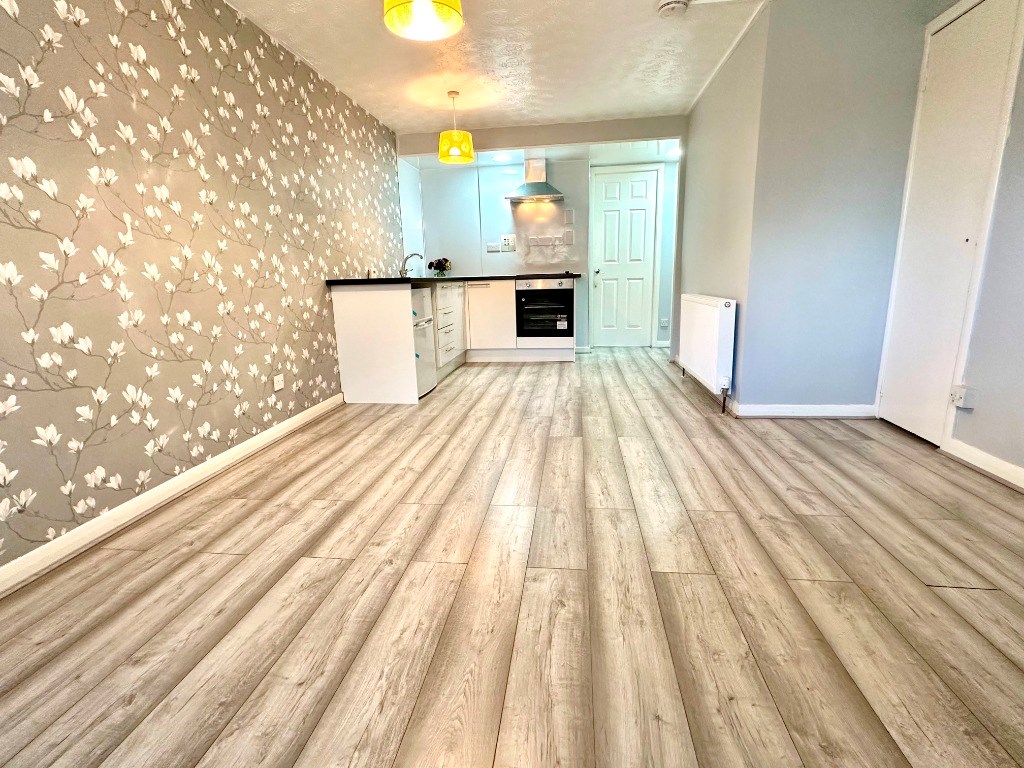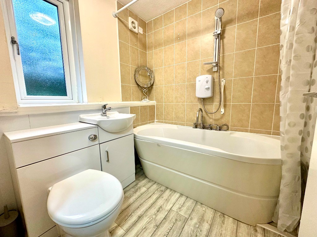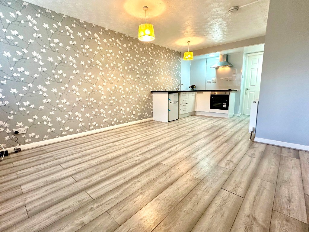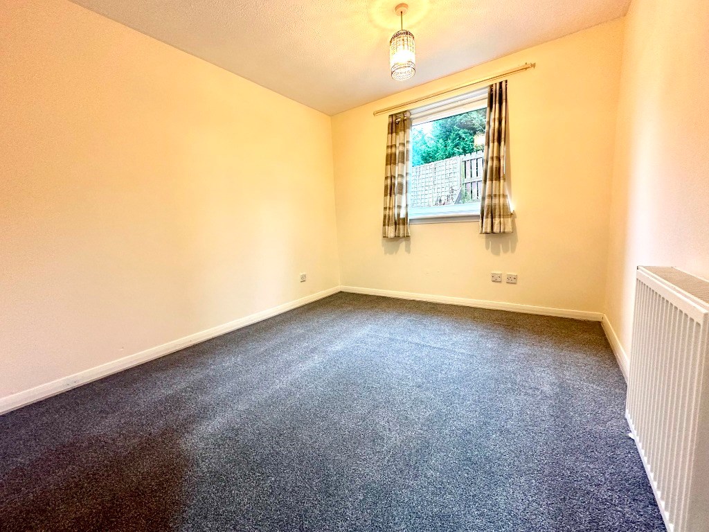 The accommodation comprises entrance vestibule, lounge open plan to kitchen area with appliances including washing machine, fridge/freezer, ceramic hob and electric oven. There are two bedrooms, one a good sized double with built in wardrobe space and the second bedroom is a small double or can be used as a single or office/study. The bathroom has a white three piece suite with electric shower over the bath.