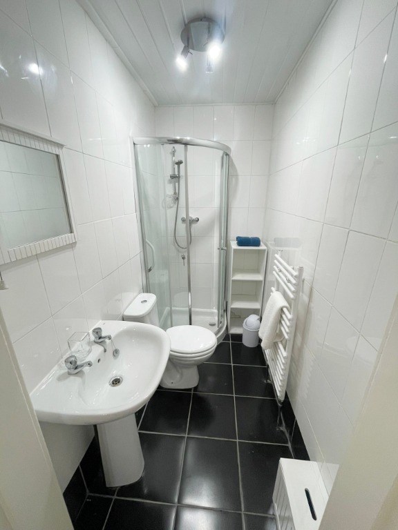 The bathroom offers a mixer shower, with modern fixtures and fittings.