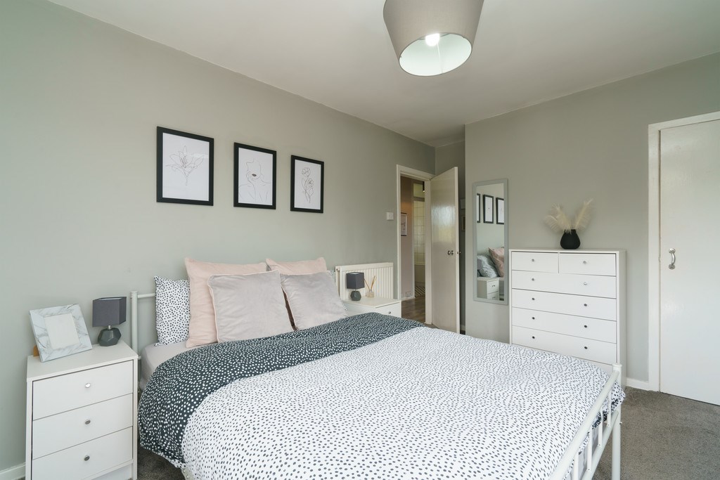 BEDROOM 2 Gorgeous large double bedroom decorating in light grey tones with plush grey carpeted flooring. Ample storage is provided by the integral wardrobes along with the free-standing chest of drawers and matching bedside tables. Equipped with a double bedframe. This bedroom benefits from a large balcony allowing ample natural light and fresh air to stream through the property.