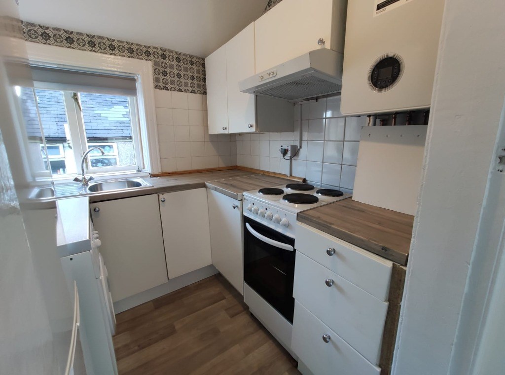The fitted kitchen contains wall and floor units with worktop surfaces. It has a single stainless steel bowl with mixer tap and side drainer. There is a freestanding electric cooker with extractor hood above. It also houses the fridge, freezer, washing machine, and new boiler.