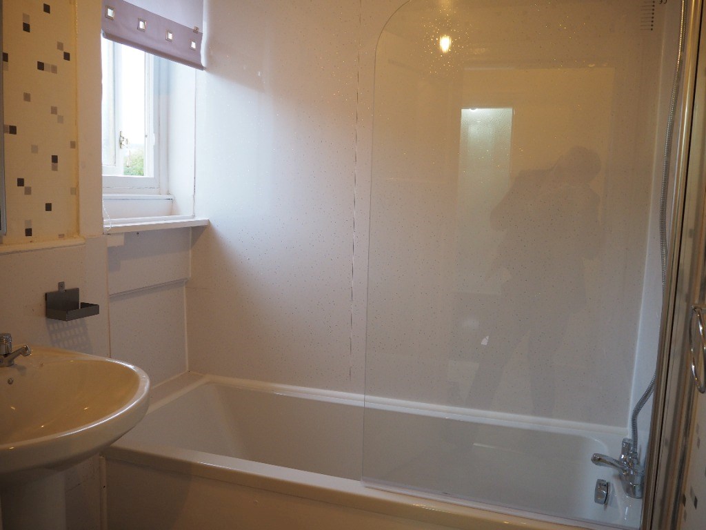 The three-piece bathroom consists of bath, wash hand basin, and WC. There are wet walls to full height around the bath area, with a shower attachment on the bath taps. There's a wall-mounted gas central heating radiator and opaque double-glazed window to side.
