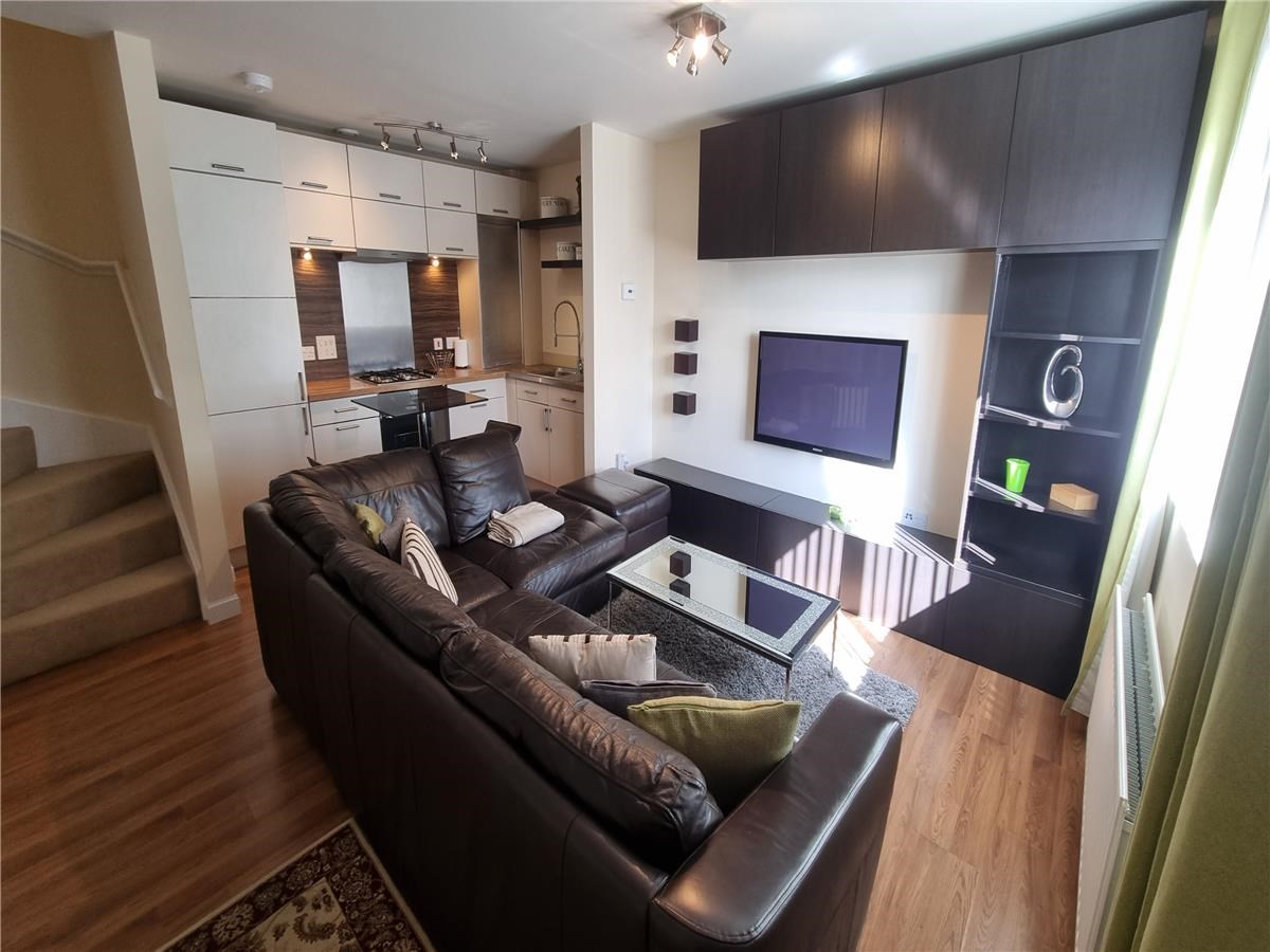This terraced house comprises of open plan lounge and fully fitted kitchen complete with dishwasher, washing machine, gas hob, oven and fridge/freezer; downstairs WC; bedroom with sofa and built in storage; double bedroom; bathroom with shower over bath.