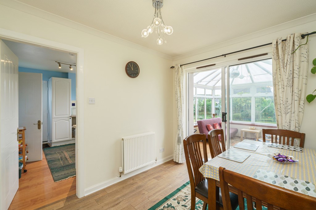 DINING ROOM Beautiful modern dining room which benefits from neutral décor and laminate flooring. This space is ideal for entertaining and enjoying family meals. French doors lead out to the large conservatory, perfect for entertaining guests. This rooms is furnished with a large dining table which can accommodate up to eight people.