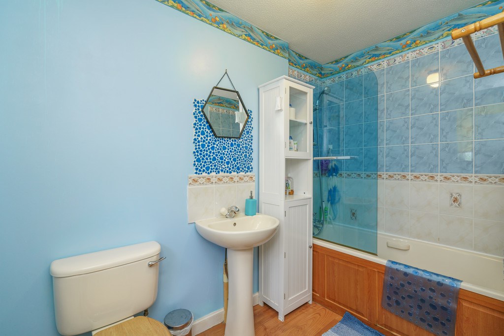 BATHROOM Great sized family bathroom with toilet and hand basin, and an mains pressure shower over the bath. Decorated in blue tiled surrounds and laminated flooring.