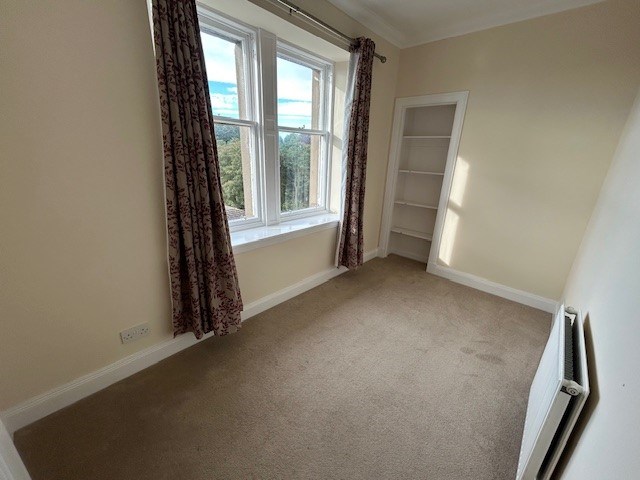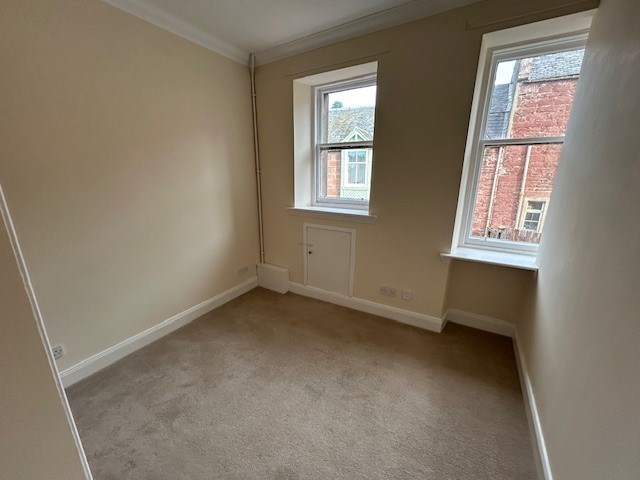 Unfurnished Accommodation:- Upper flat set in a secluded Lane yet right in the middle of Kirriemuir, close to shops, car park and bus route. The accommoation comprises one double and one single Bedroom, Living Room with traditional style fireplace, Fitted Kitchen with built in oven and hob., Shower Room. Benefits from GCH and private garden to rear. New carpets fitted throughout.