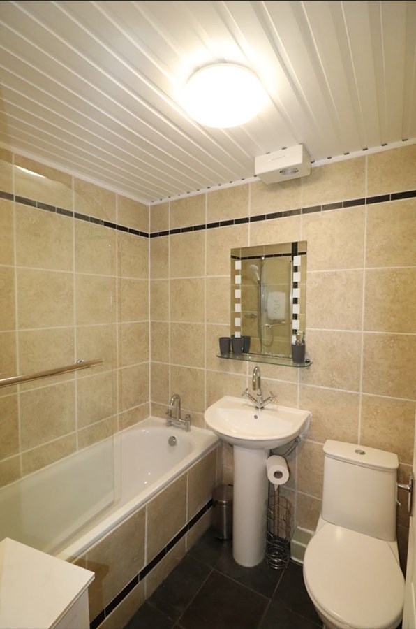 Fitted with a modern three-piece suite in white with chrome fittings, comprising W.C. wash hand basin and bath. Electric shower over bath with glass screen. Tiled walls and contrasting tiled floor. Towel rail, mirror with shelf below and white storage unit.