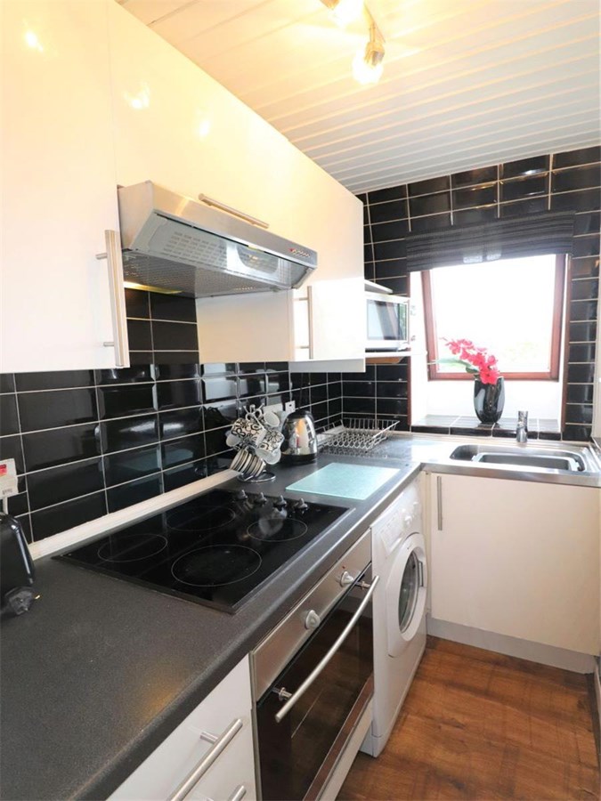 Galley kitchen with window to the rear. Well planned and fitted with a good range of units in white gloss finish, sink and drainer. Appliances comprise a built-in stainless steel electric oven, ceramic hob with cooker hood, and large fridge freezer, automatic washing machine, microwave, toaster, kettle, cutlery, and crockery provided. Additional storage cupboards and racking in the corridor linking to the living room. Walnut laminate flooring.