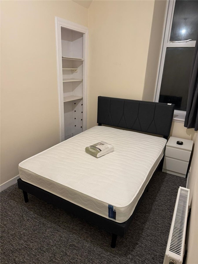 The double bedroom with new double bed and mattress, bedside table and drawers, is located at the rear of the property overlooking the quiet communal garden.