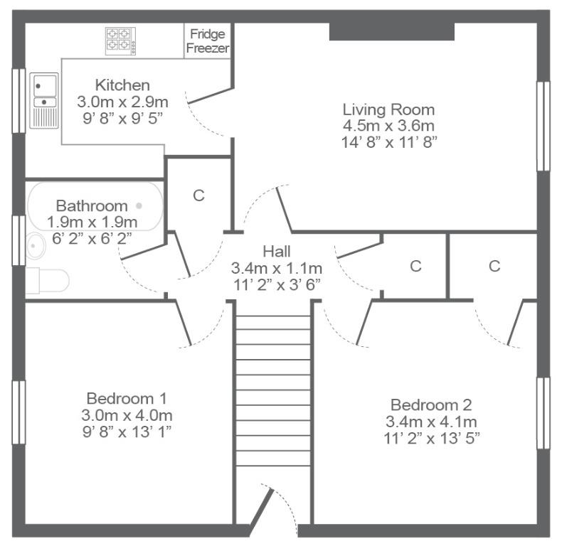 This property is situated on the upper floor within a traditional four in a block building and comprises internally of staircase to reach the upper floor leading to the landing which has two large storage cupboards. There are two good sized double bedrooms, one with handy storage cupboard off, a spacious and bright living room, bathroom with white three piece bathroom suite and mains powered shower over the bath and finally the stylish kitchen with ample wall and floor fitted units which comes complete with appliances including fridge freezer, gas hob and electric oven. A washing machine is not supplied in this property.
