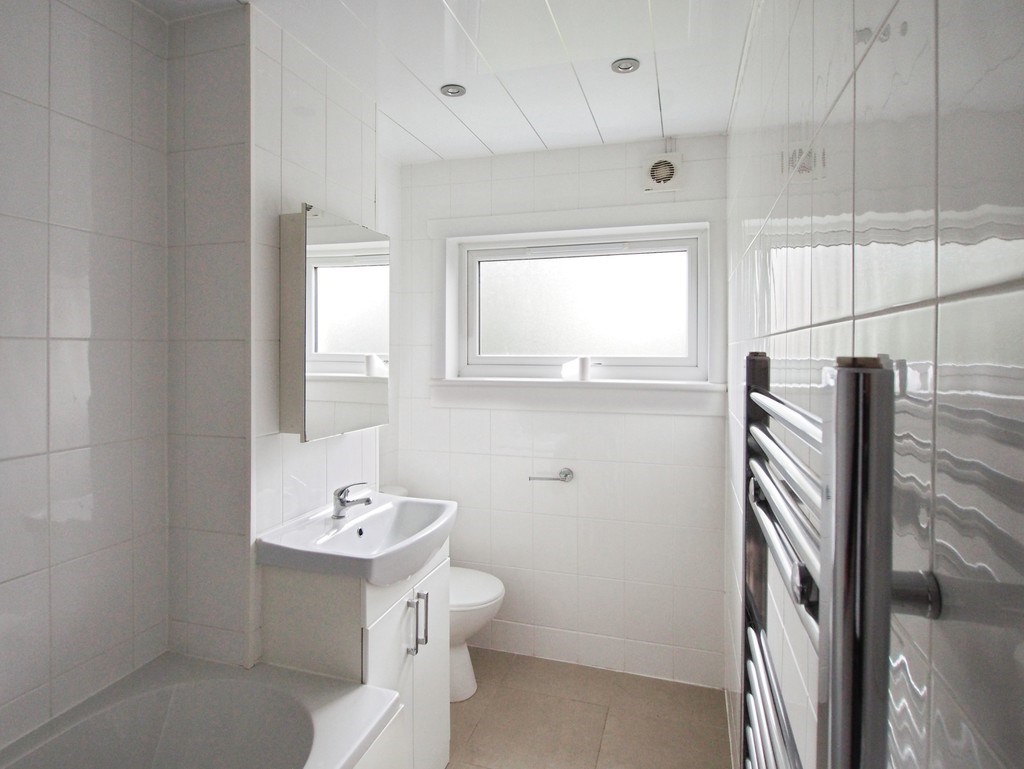 A modern bathroom complements the living space, complete with an over bath shower, updated fittings, and a heated towel rail for added comfort.