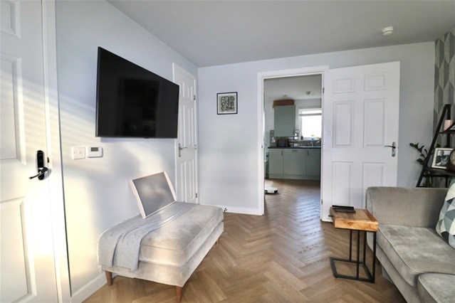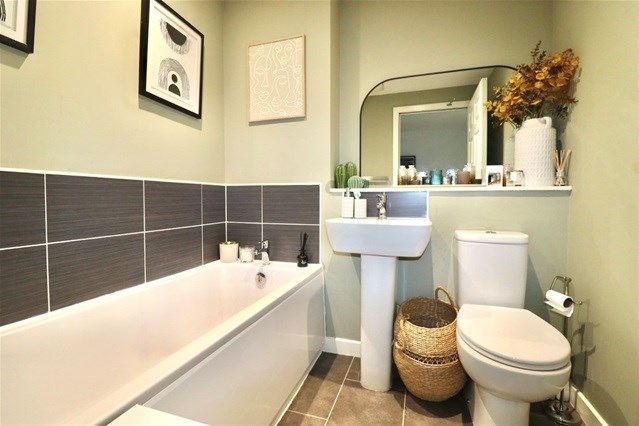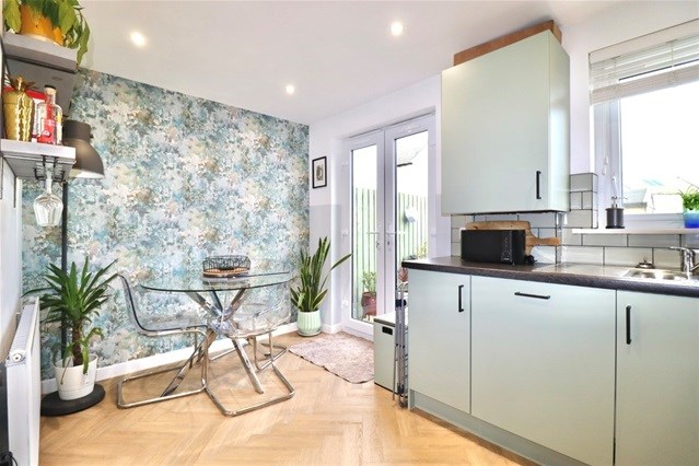 The ground floor welcomes you with a bright reception hallway leading to a front-facing lounge featuring modern décor, quality furnishings, and useful storage. To the rear, a stunning kitchen-diner showcases fabulous sage-coloured cabinetry, integrated appliances, including: fridge freezer, dishwasher, oven, hob, and washing machine. French doors open out to the enclosed private garden and a handy downstairs WC completes this level.