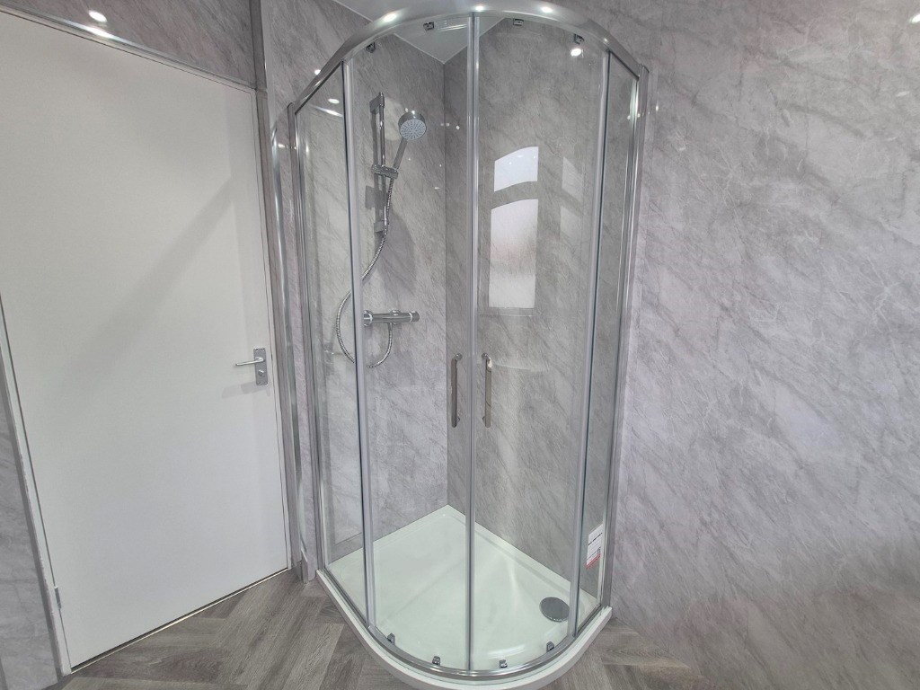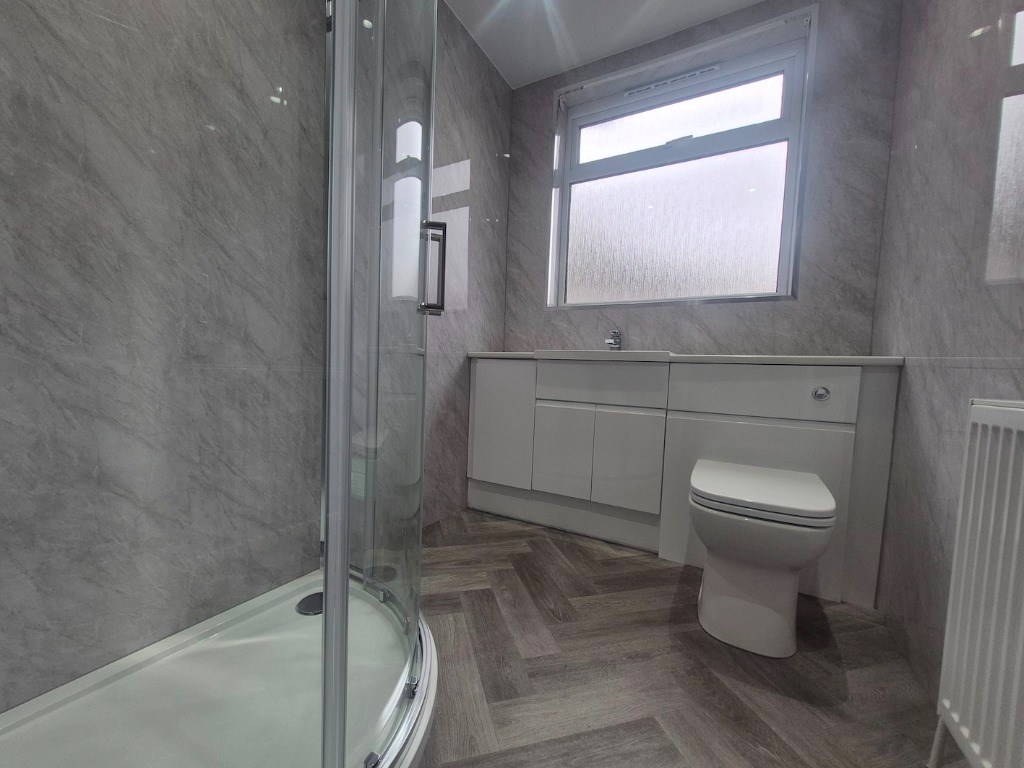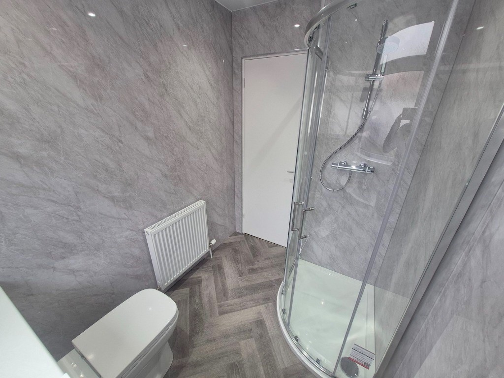 Newly fitted shower room with a shower, sink and WC, chrome heated towel radiator and tiled floor.