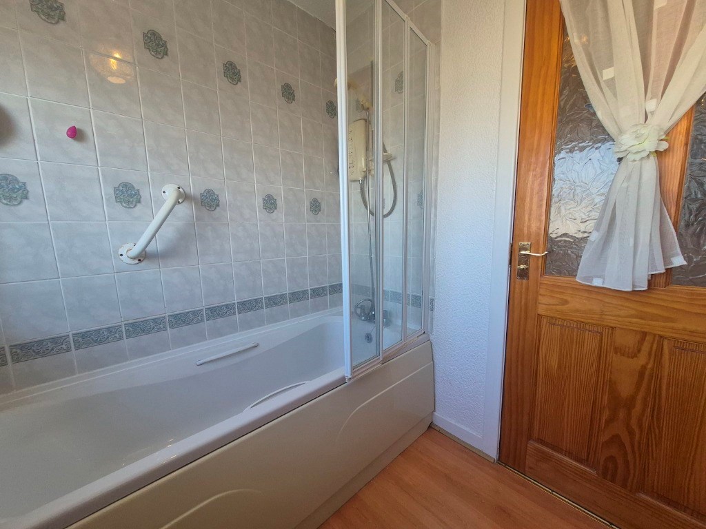 A three piece bathroom suite with an electric shower.