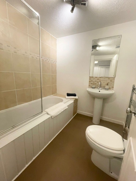 Bathroom is decorated with neutral colours, 3 piece matching suite with an electric shower over the bath.
