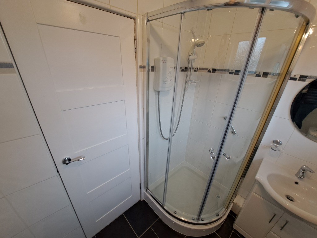 Modern Shower room with an electric shower, sink and WC.